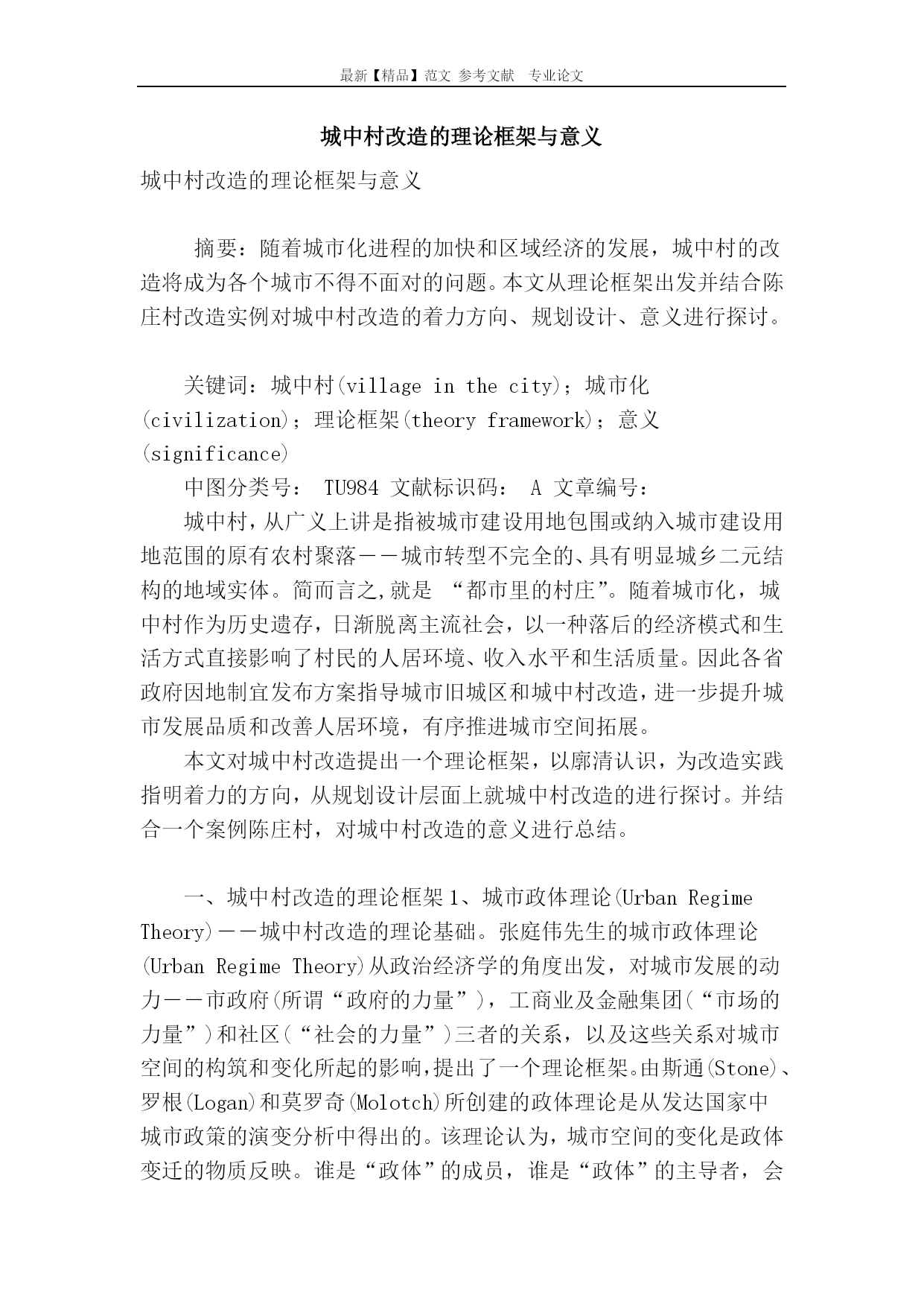 最新【精品】范文参考文献专业论文城中村改造的理论框架与意义城中村改造的理论框架与意义摘要:随着城市化进程的加快和区域经济的发展,城中村的改造将成为各个城市不得不面对的问题。本文从理论框架出发并结合陈庄村改造实例对城中村改造的着力方向、规划设计、意义进行探讨。关键词:城中村(villageinthecity);城市化(civilization);理论框架(theoryframework);意义(significance)中图分类号:TU984文献标识码:A文章编号:城中村,从广义上讲是指被城市建设用地包围或