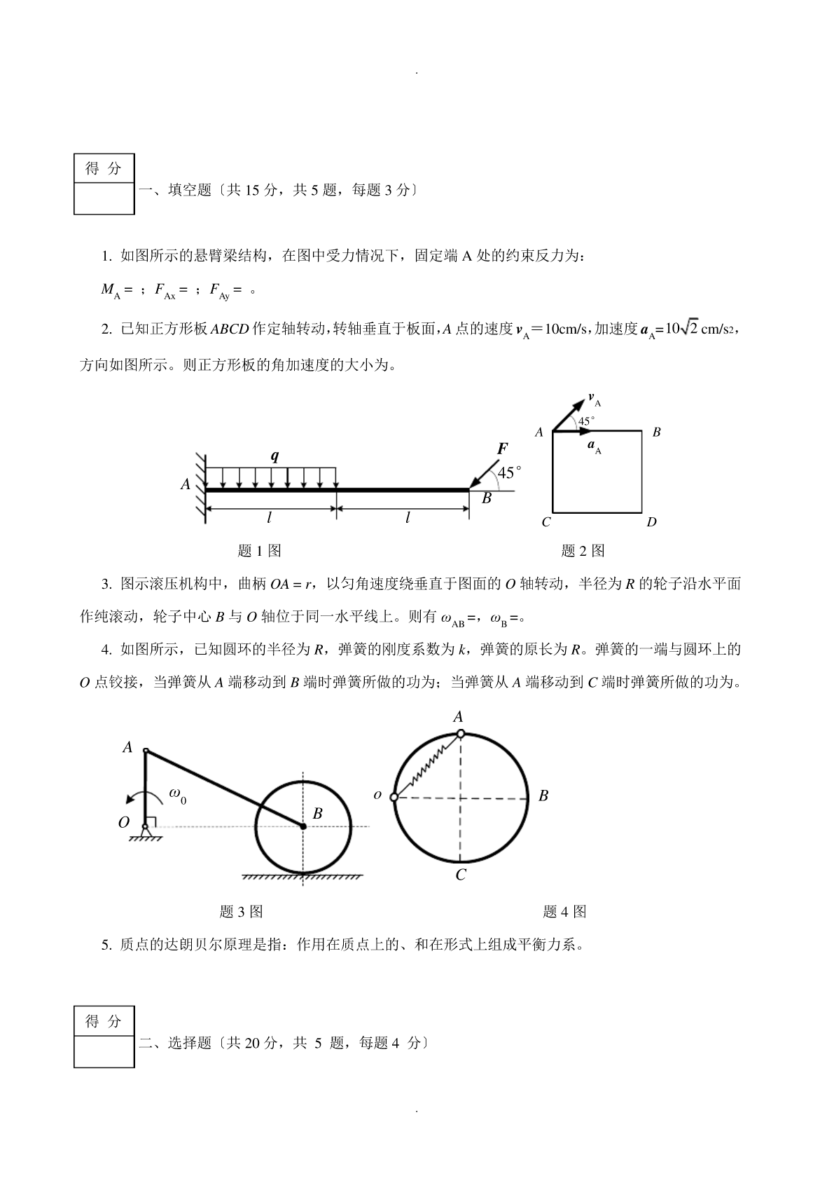 .得分一、填空题〔共15分,共5题,每题3分〕1.如图所示的悬臂梁结构,在图中受力情况下,固定端A处的约束反力为:;;。MA=FAx=FAy=已知正方形板作定轴转动,转轴垂直于板面,点的速度=,加速度1022,2.ABCDAvA10cm/saA=cm/s方向如图所示。则正方形板的角加速度的大小为。vA45°ABaqFA45°ABllCD题1图题2图3.图示滚压机构中,曲柄OA=r,以匀角速度绕垂直于图面的O轴转动,半径为R的轮子沿水平面作纯滚动,轮子中心与轴位于同一水平线上。则有,。BOωAB=ωB=4.