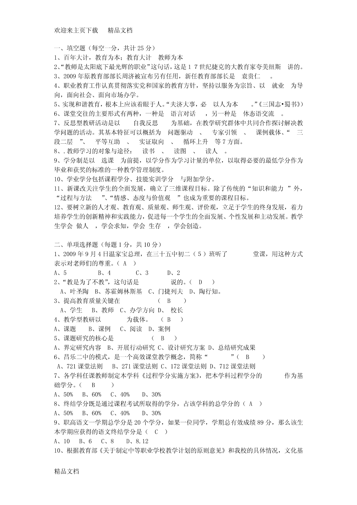 欢迎来主页下载精品文档一、填空题(每空一分,共计25分)1、百年大计,教育为本;教育大计教师为本2、“教师是太阳底下最光辉的职业”这句话,这是17世纪捷克的大教育家夸美纽斯讲的。3、2009年原教育部部长周济被宣布另有任用,新任教育部部长是袁贵仁。4、职业教育工作认真贯彻落实党和国家的教育方针,坚持以服务为宗旨、以就业为导向,面向社会、面向市场办学。5、实现和谐教育,根本上应该着眼于人。“夫济大事,必以人为本。”《三国志•蜀书》)6、课堂交往的主要形式有两种,一种是语言对话,另一种是体态语交流。7