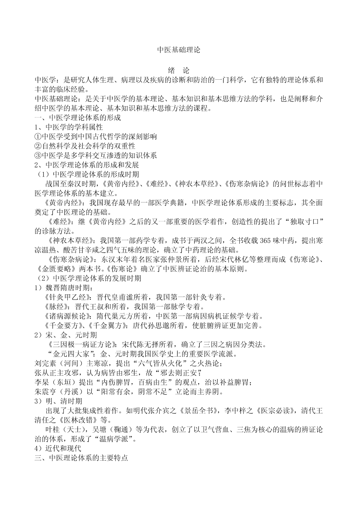 中医基础理论绪论中医学:是研究人体生理、病理以及疾病的诊断和防治的一门科学,它有独特的理论体系和丰富的临床经验。中医基础理论:是关于中医学的基本理论、基本知识和基本思维方法的学科,也是阐释和介绍中医学的基本理论、基本知识和基本思维方法的课程。一、中医学理论体系的形成1、中医学的学科属性①中医学受到中国古代哲学的深刻影响②自然科学及社会科学的双重性③中医学是多学科交互渗透的知识体系2、中医学理论体系的形成和发展(1)中医学理论体系的形成时期战国至秦汉时期,《黄帝内经》、《难经》、《神农本草经》、《伤寒杂病论