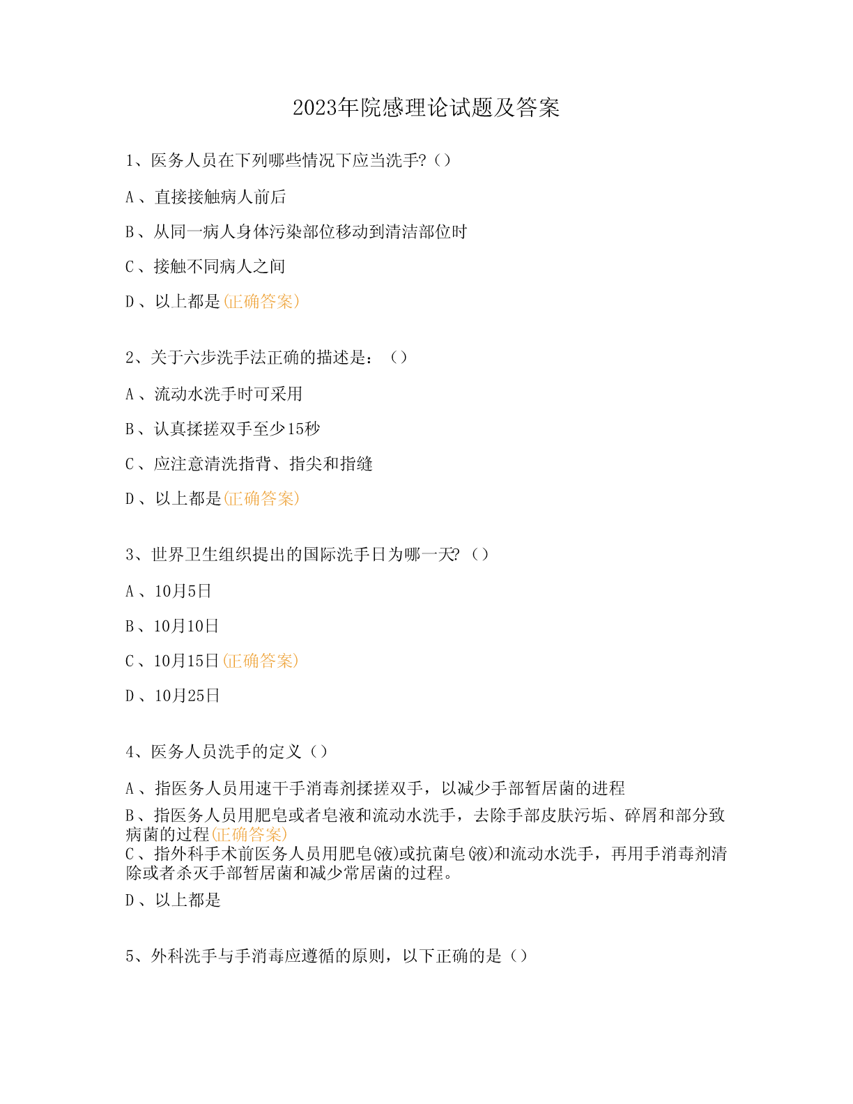 2023年院感理论试题及答案1、医务人员在下列哪些情况下应当洗手?()A、直接接触病人前后B、从同一病人身体污染部位移动到清洁部位时C、接触不同病人之间D、以上都是(正确答案)2、关于六步洗手法正确的描述是:()A、流动水洗手时可采用B、认真揉搓双手至少15秒C、应注意清洗指背、指尖和指缝D、以上都是(正确答案)3、世界卫生组织提出的国际洗手日为哪一天?()A、10月5日B、10月10日C、10月15日(正确答案)D、10月25日4、医务人员洗手的定义()A、指医务人员用速干手消毒剂揉搓双手,以减少手部暂