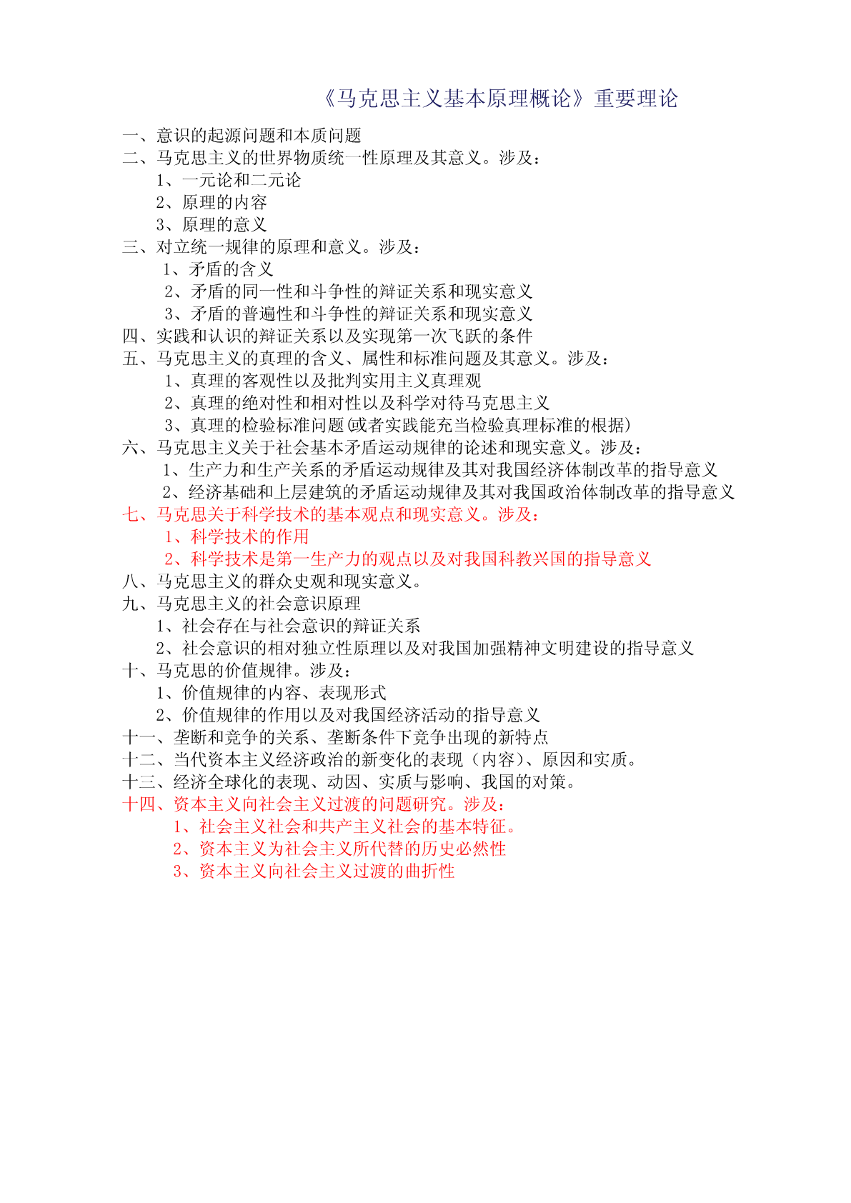 《马克思主义基本原理概论》重要理论一、意识的起源问题和本质问题二、马克思主义的世界物质统一性原理及其意义。涉及:1、一元论和二元论2、原理的内容3、原理的意义三、对立统一规律的原理和意义。涉及:1、矛盾的含义2、矛盾的同一性和斗争性的辩证关系和现实意义3、矛盾的普遍性和斗争性的辩证关系和现实意义四、实践和认识的辩证关系以及实现第一次飞跃的条件五、马克思主义的真理的含义、属性和标准问题及其意义。涉及:1、真理的客观性以及批判实用主义真理观2、真理的绝对性和相对性以及科学对待马克思主义3、真理的检验标准问题(