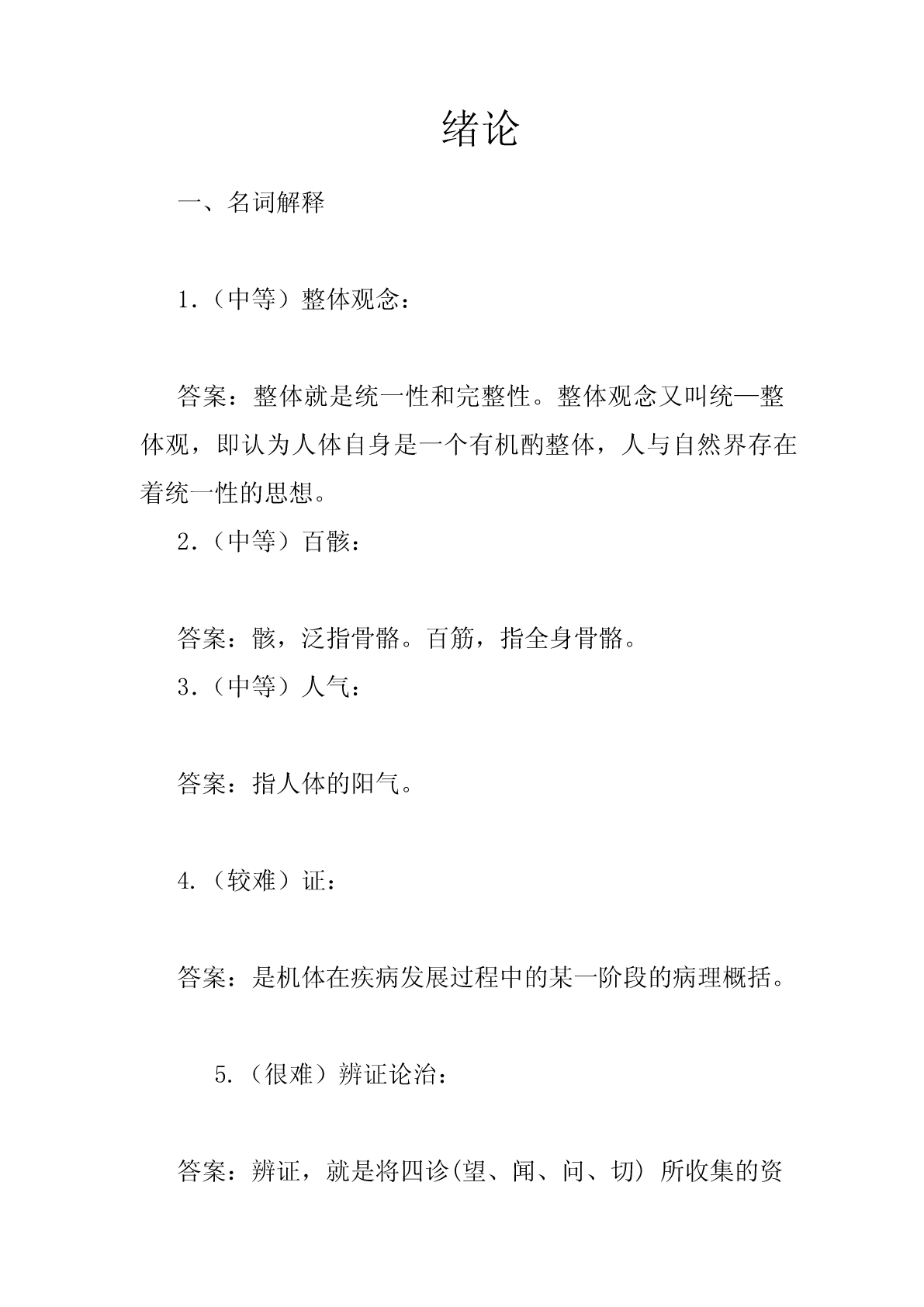 绪论一、名词解释1.(中等)整体观念:答案:整体就是统一性和完整性。整体观念又叫统—整体观,即认为人体自身是一个有机酌整体,人与自然界存在着统一性的思想。2.(中等)百骸:答案:骸,泛指骨骼。百筋,指全身骨骼。3.(中等)人气:答案:指人体的阳气。4.(较难)证:答案:是机体在疾病发展过程中的某一阶段的病理概括。5.(很难)辨证论治:答案:辨证,就是将四诊(望、闻、问、切)所收集的资料、症状和体征,通过分析、综合,辨清疾病的原因、性质、部位,以及邪正之间的关系,概括、判断为某种性质的证。论治,又称施治,是