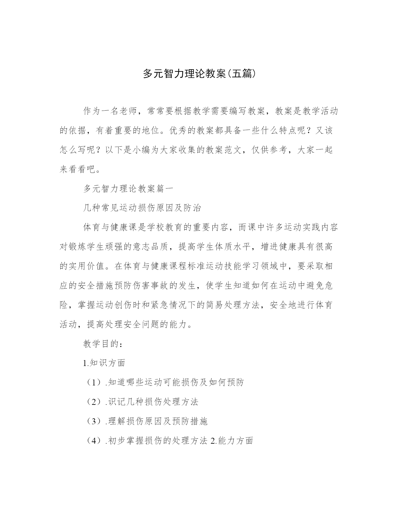 多元智力理论教案(五篇)作为一名老师,常常要根据教学需要编写教案,教案是教学活动的依据,有着重要的地位。优秀的教案都具备一些什么特点呢?又该怎么写呢?以下是小编为大家收集的教案范文,仅供参考,大家一起来看看吧。多元智力理论教案篇一几种常见运动损伤原因及防治体育与健康课是学校教育的重要内容,而课中许多运动实践内容对锻炼学生顽强的意志品质,提高学生体质水平,增进健康具有很高的实用价值。在体育与健康课程标准运动技能学习领域中,要采取相应的安全措施预防伤害事故的发生,使学生知道如何在运动中避免危险,掌握运动创伤时