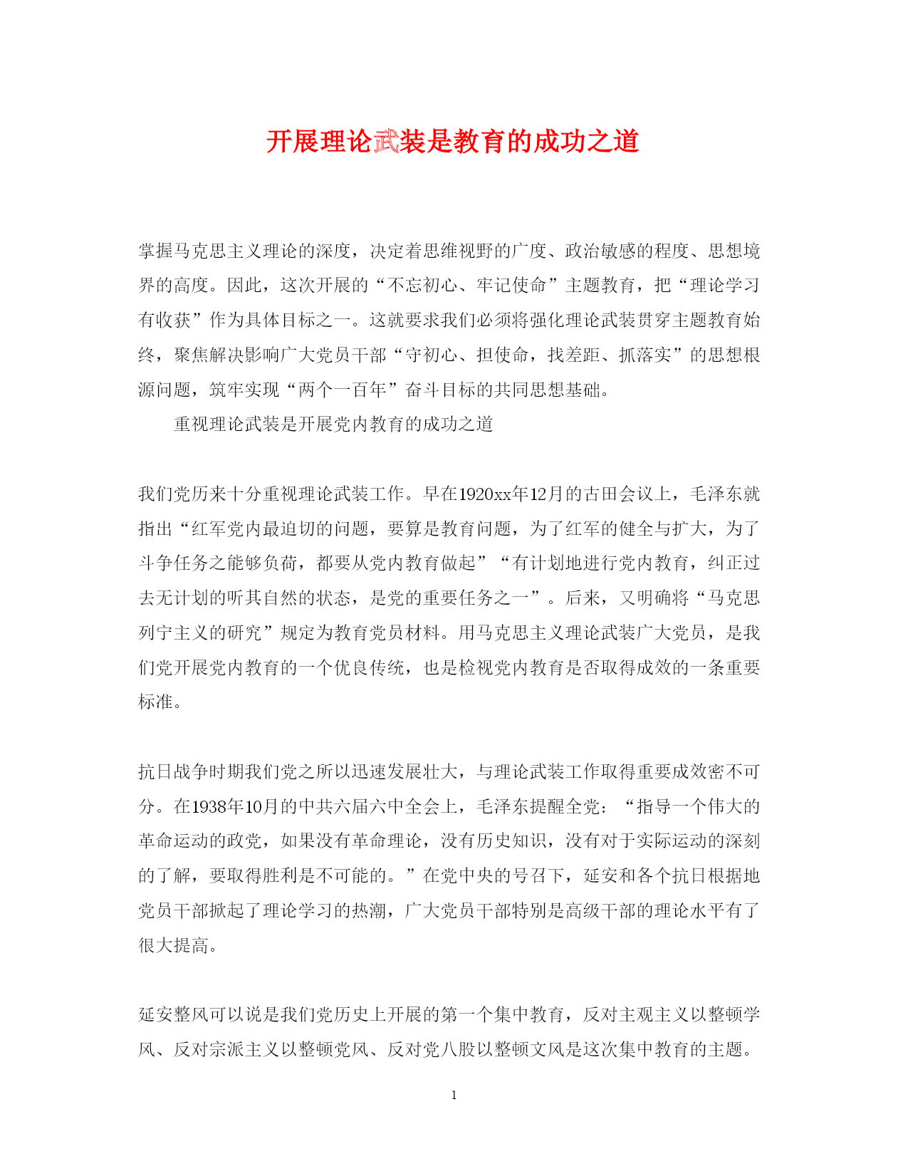 此资料由网络收集而来,如有侵权请告知上传者立即删除。资料共分享,我们负责传递知识。PAGEPAGE5开展理论武装是教育的成功之道掌握马克思主义理论的深度,决定着思维视野的广度、政治敏感的程度、思想境界的高度。因此,这次开展的“不忘初心、牢记使命”主题教育,把“理论学习有收获”作为具体目标之一。这就要求我们必须将强化理论武装贯穿主题教育始终,聚焦解决影响广大党员干部“守初心、担使命,找差距、抓落实”的思想根源问题,筑牢实现“两个一百年”奋斗目标的共同思想基础。重视理论武装是开展党内教育的成功之道