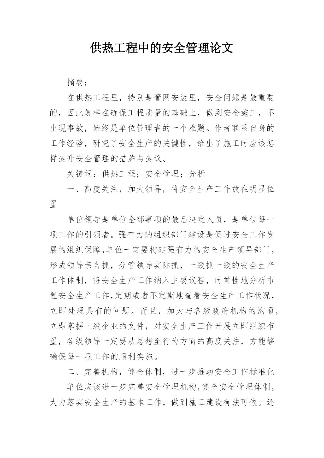 供热工程中的安全管理论文摘要:在供热工程里,特别是管网安装里,安全问题是最重要的,因此怎样在确保工程质量的基础上,做到安全施工,不出现事故,始终是单位管理者的一个难题。作者联系自身的工作经验,研究了安全生产的关键性,给出了施工时应该怎样提升安全管理的措施与提议。关键词:供热工程;安全管理;分析一、高度关注,加大领导,将安全生产工作放在明显位置单位领导是单位全部事项的最后决定人员,是单位每一项工作的引领者。强有力的组织部门建设是促进安全工作发展的组织保障,单位一定要构建强有力的安全生产领导部门,形成领导亲自