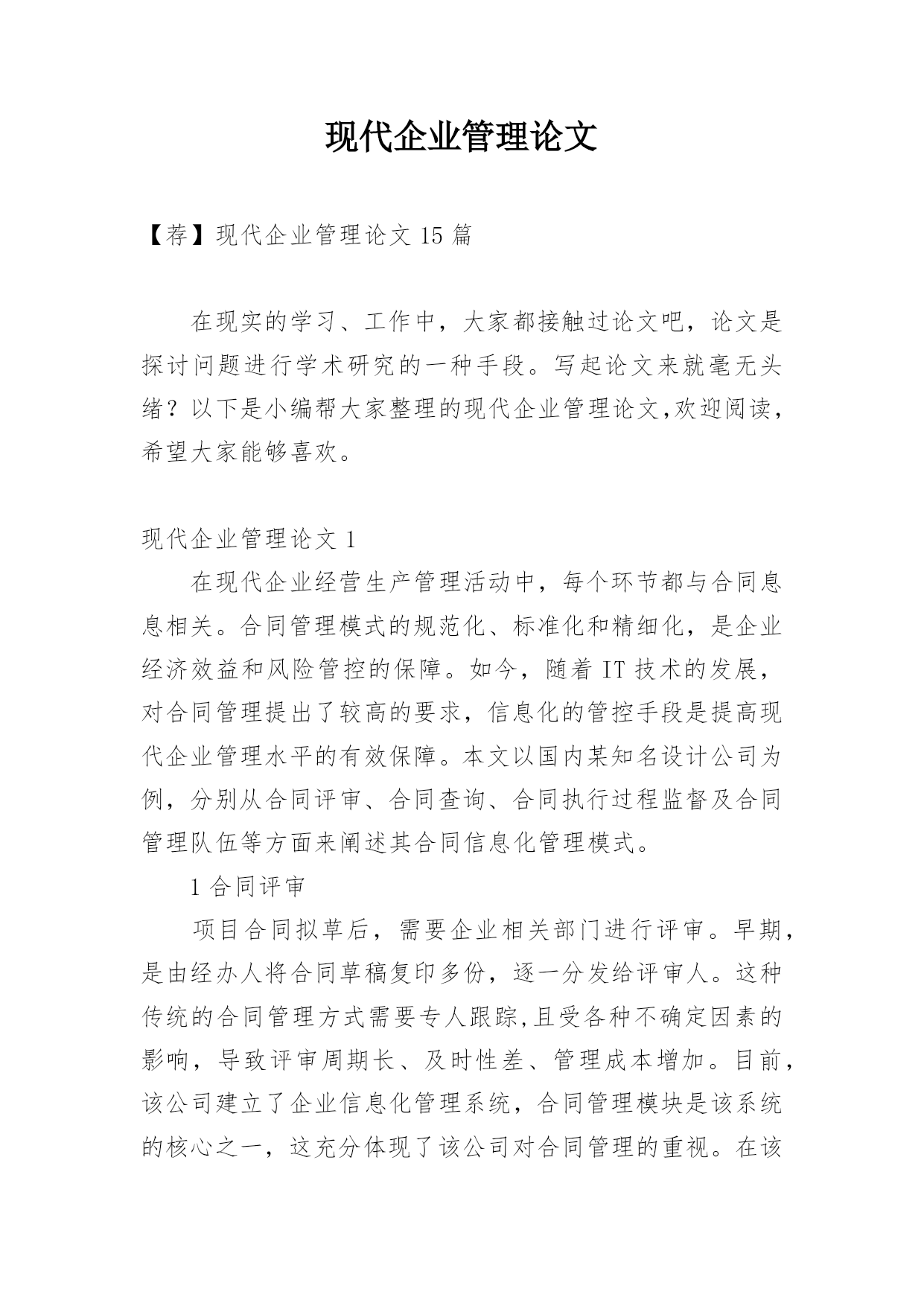 现代企业管理论文【荐】现代企业管理论文15篇在现实的学习、工作中,大家都接触过论文吧,论文是探讨问题进行学术研究的一种手段。写起论文来就毫无头绪?以下是小编帮大家整理的现代企业管理论文,欢迎阅读,希望大家能够喜欢。现代企业管理论文1在现代企业经营生产管理活动中,每个环节都与合同息息相关。合同管理模式的规范化、标准化和精细化,是企业经济效益和风险管控的保障。如今,随着IT技术的发展,对合同管理提出了较高的要求,信息化的管控手段是提高现代企业管理水平的有效保障。本文以国内某知名设计公司为例,分别从合同评审、合