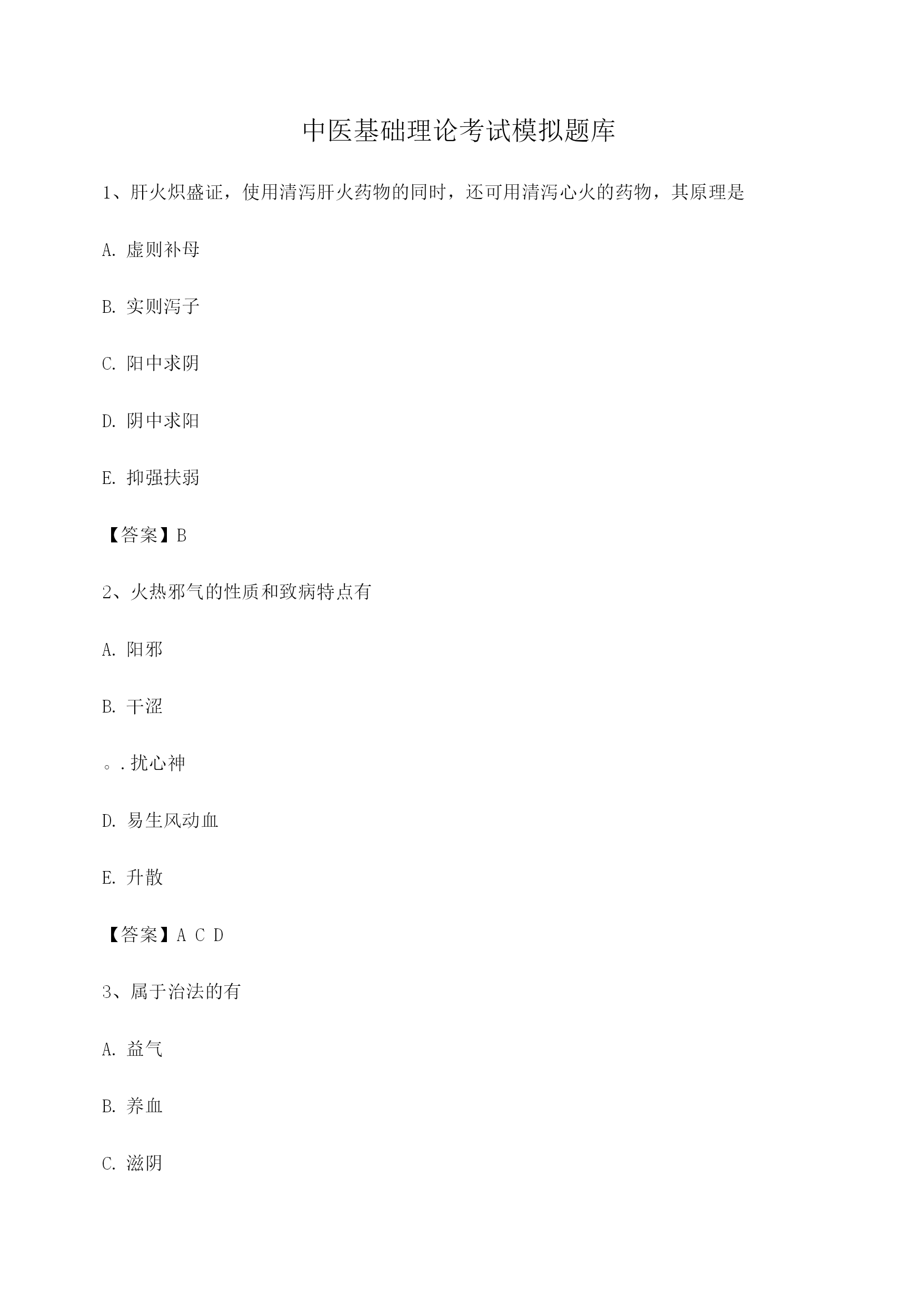 中医基础理论考试模拟题库1、肝火炽盛证,使用清泻肝火药物的同时,还可用清泻心火的药物,其原理是虚则补母实则泻子阳中求阴阴中求阳抑强扶弱【答案】B2、火热邪气的性质和致病特点有阳邪干涩。.扰心神易生风动血升散【答案】ACD3、属于治法的有益气养血滋阴治标治本【答案】ABC4、影响人体的外环境因素有气候变化地域特点生活环境工作环境社会环境【答案】ABCDE5、某男,65岁。年老体弱,少气乏力,自汗,小便清长,尿频,夜间尤重,其病机是气失推动气失防御气失固摄气失温煦气失营养【答案】C6、任脉的主要功能有调节阴经