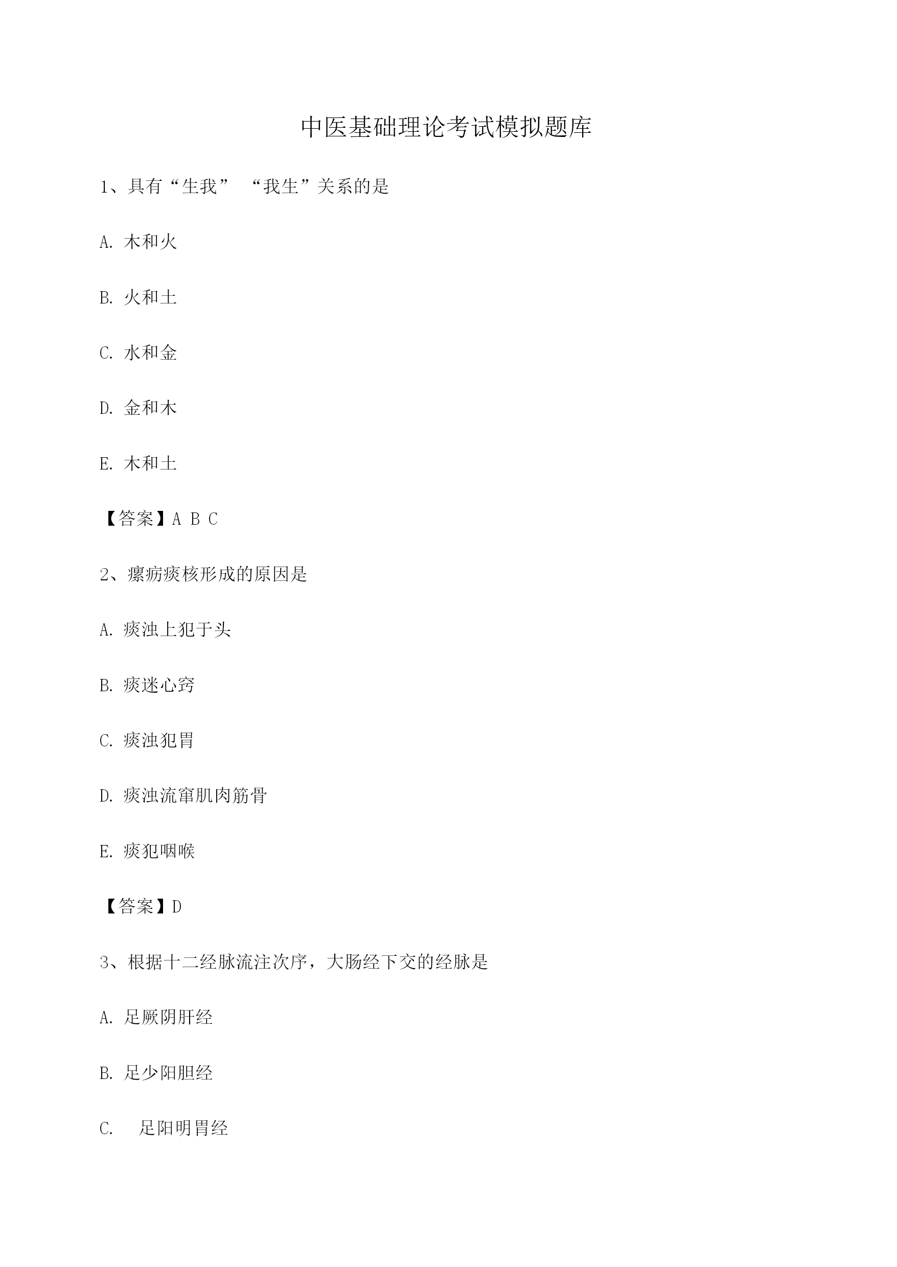 中医基础理论考试模拟题库1、具有“生我”“我生”关系的是木和火火和土水和金金和木木和土【答案】ABC2、瘰疬痰核形成的原因是痰浊上犯于头痰迷心窍痰浊犯胃痰浊流窜肌肉筋骨痰犯咽喉【答案】D3、根据十二经脉流注次序,大肠经下交的经脉是足厥阴肝经足少阳胆经足阳明胃经手太阳小肠经足太阳膀胱经【答案】C4、不属于五行之“金”的是六腑之大肠五体之皮五志之思五化之收五色之白【答案】C5、中医学认为,构成人体有机整体的中心是五脏六腑脑命门经络【答案】A6、“阴阳者,数之可十,推之可百,数之可千,推之可万”主要说明的是阴阳