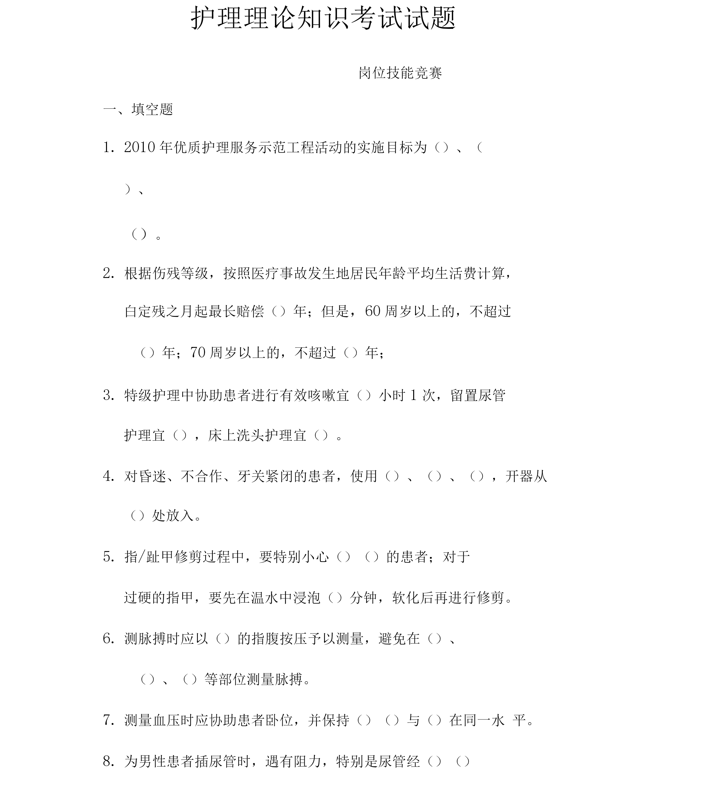 护理理论知识考试试题岗位技能竞赛一、填空题2010年优质护理服务示范工程活动的实施目标为()、()、()。根据伤残等级,按照医疗事故发生地居民年龄平均生活费计算,白定残之月起最长赔偿()年;但是,60周岁以上的,不超过()年;70周岁以上的,不超过()年;特级护理中协助患者进行有效咳嗽宜()小时1次,留置尿管护理宜(),床上洗头护理宜()。对昏迷、不合作、牙关紧闭的患者,使用()、()、(),开器从()处放入。指/趾甲修剪过程中,要特别小心()()的患者;对于过硬的指甲,要先在温水中浸泡()分钟,软化后再