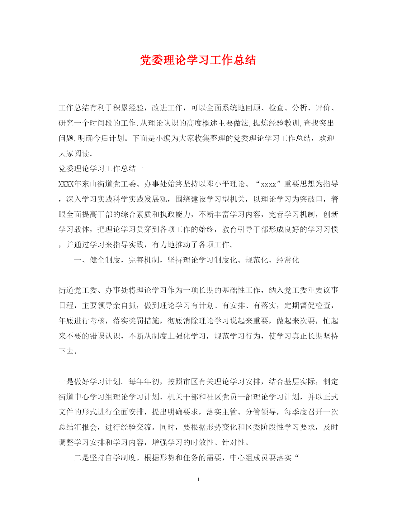 此资料由网络收集而来,如有侵权请告知上传者立即删除。资料共分享,我们负责传递知识。PAGEPAGE16党委理论学习工作总结工作总结有利于积累经验,改进工作,可以全面系统地回顾、检查、分析、评价、研究一个时间段的工作,从理论认识的高度概述主要做法,提炼经验教训,查找突出问题,明确今后计划。下面是小编为大家收集整理的党委理论学习工作总结,欢迎大家阅读。党委理论学习工作总结一XXXX年东山街道党工委、办事处始终坚持以邓小平理论、“xxxx”重要思想为指导,深入学习实践科学实践发展观,围绕建设学习型机