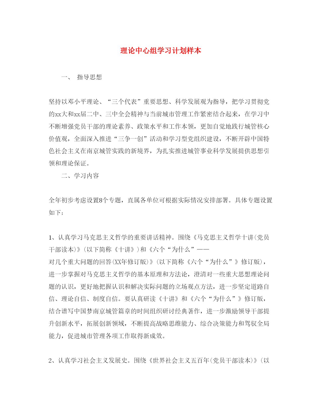 此资料由网络收集而来,如有侵权请告知上传者立即删除。资料共分享,我们负责传递知识。理论中心组学习计划样本一、指导思想坚持以邓小平理论、“三个代表”重要思想、科学发展观为指导,把学习贯彻党的xx大和xx届二中、三中全会精神与当前城市管理工作紧密结合起来,在学习中不断增强党员干部的理论素养、政策水平和工作本领,更加自觉地践行城管核心价值观,全面深入推进“三争一创”活动和学习型党组织建设,不断开辟中国特色社会主义在南京城管实践的新境界,为扎实推进城管事业科学发展提供思想引领和理论保证。二、学习内容全年初步考虑设