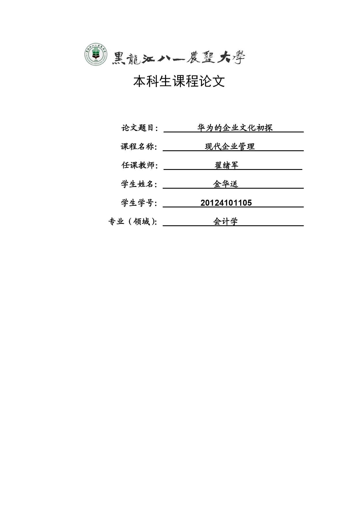 本科生课程论文论文题目:华为的企业文化初探课程名称:现代企业管理任课教师:翟绪军学生姓名:金华送学生学号:20124101105专业(领域):会计学摘要现代企业管理研究发现:凡是成功的企业都有优秀的文化,反之,凡是失败的企业都存在着不良的文化。企业的文化建设对企业的发展起着越来越重要的作用。华为作为中国的优秀企业,在其创立与发展的过程中形成了独特的企业文化,也推动着企业的巨大进步。随着企业的不断发展,华为的企业文化也以温和的方式发生着变革。本文通过对华为企业文化的分析,探讨企业文化的重要性以及变革的必要性