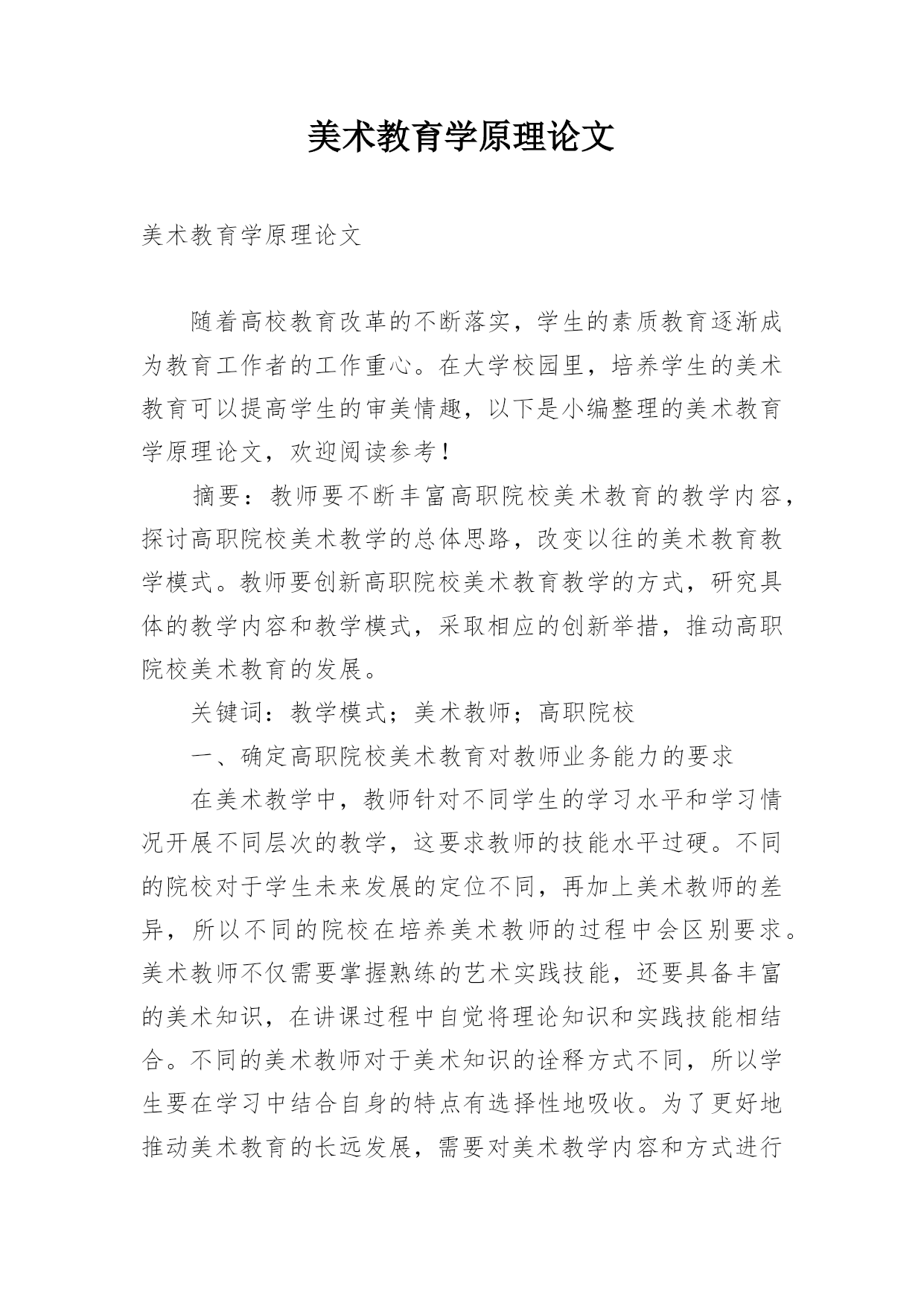 美术教育学原理论文美术教育学原理论文随着高校教育改革的不断落实,学生的素质教育逐渐成为教育工作者的工作重心。在大学校园里,培养学生的美术教育可以提高学生的审美情趣,以下是小编整理的美术教育学原理论文,欢迎阅读参考!摘要:教师要不断丰富高职院校美术教育的教学内容,探讨高职院校美术教学的总体思路,改变以往的美术教育教学模式。教师要创新高职院校美术教育教学的方式,研究具体的教学内容和教学模式,采取相应的创新举措,推动高职院校美术教育的发展。关键词:教学模式;美术教师;高职院校一、确定高职院校美术教育对教师业务能