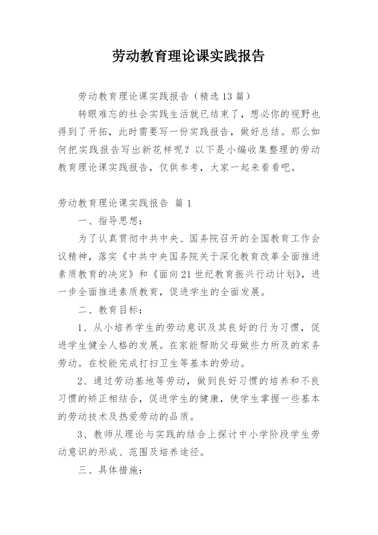 劳动教育理论课实践报告劳动教育理论课实践报告(精选13篇)转眼难忘的社会实践生活就已结束了,想必你的视野也得到了开拓,此时需要写一份实践报告,做好总结。那么如何把实践报告写出新花样呢?以下是小编收集整理的劳动教育理论课实践报告,仅供参考,大家一起来看看吧。劳动教育理论课实践报告篇1一、指导思想:为了认真贯彻中共中央、国务院召开的全国教育工作会议精神,落实《中共中央国务院关于深化教育改革全面推进素质教育的决定》和《面向21世纪教育振兴行动计划》,进一步全面推进素质教育,促进学生的全面发展。二、教育目标:1、