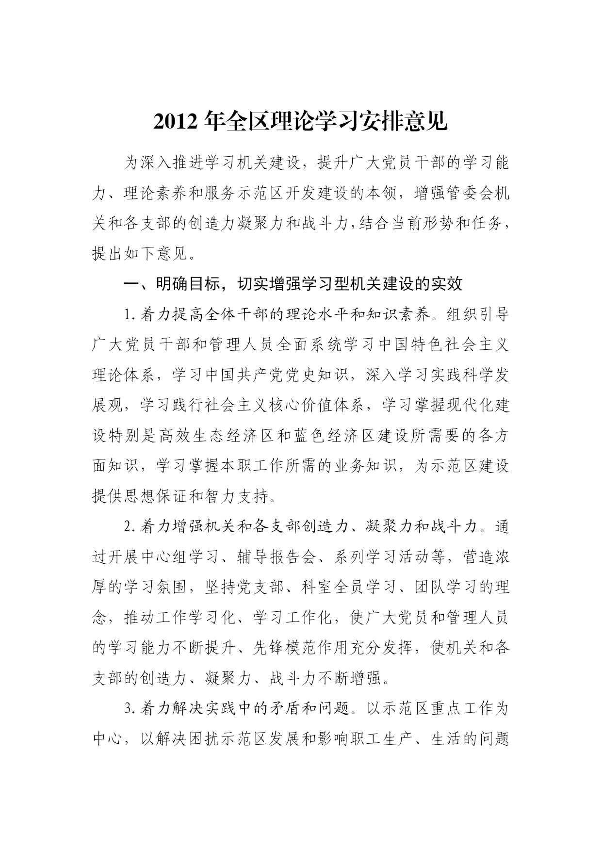 2012年全区理论学习安排意见为深入推进学习机关建设,提升广大党员干部的学习能力、理论素养和服务示范区开发建设的本领,增强管委会机关和各支部的创造力凝聚力和战斗力,结合当前形势和任务,提出如下意见。一、明确目标,切实增强学习型机关建设的实效1.着力提高全体干部的理论水平和知识素养。组织引导广大党员干部和管理人员全面系统学习中国特色社会主义理论体系,学习中国共产党党史知识,深入学习实践科学发展观,学习践行社会主义核心价值体系,学习掌握现代化建设特别是高效生态经济区和蓝色经济区建设所需要的各方面知识,学习掌握