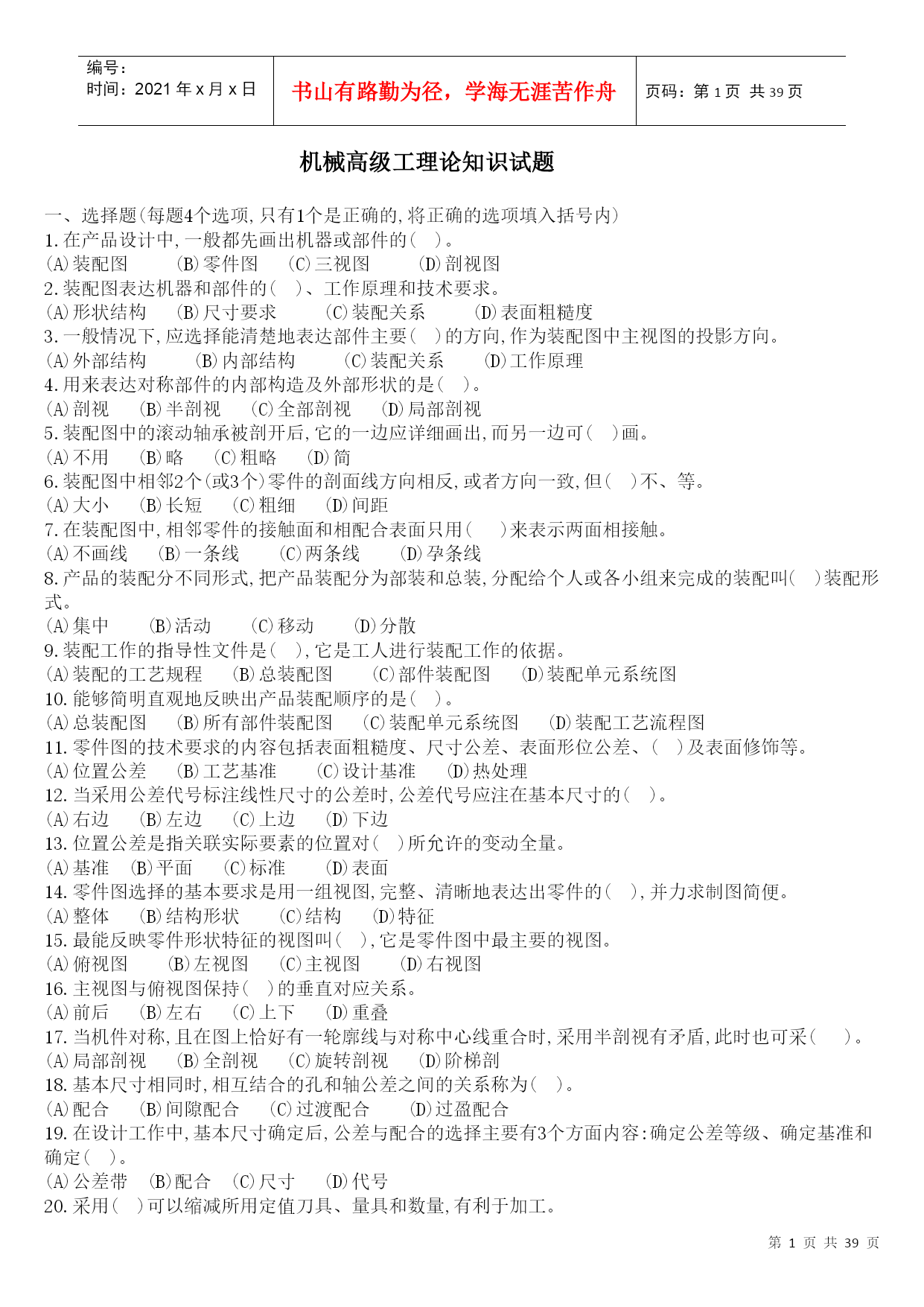 编号:时间:2021年x月x日书山有路勤为径,学海无涯苦作舟页码:第PAGE39页共NUMPAGES39页第PAGE\*MERGEFORMAT39页共NUMPAGES\*MERGEFORMAT39页机械高级工理论知识试题一、选择题(每题4个选项,只有1个是正确的,将正确的选项填入括号内)1.在产品设计中,一般都先画出机器或部件的()。(A)装配图(B)零件图(C)三视图(D)剖视图2.装配图表达机器和部件的()、工作原理和技术要求。(A)形状结构(B)尺寸要求(C)装配关系(D)表
