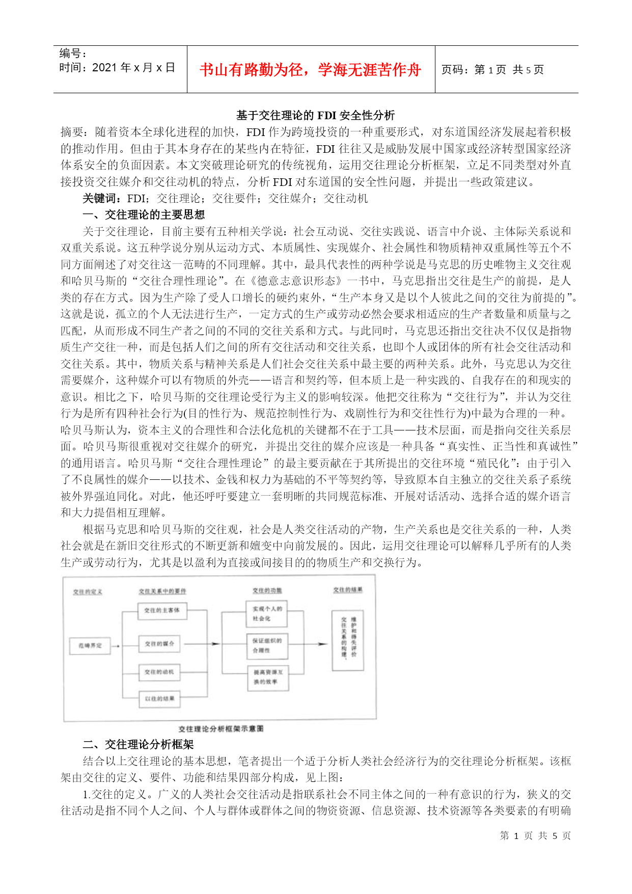 编号:时间:2021年x月x日书山有路勤为径,学海无涯苦作舟页码:第PAGE5页共NUMPAGES5页第PAGE\*MERGEFORMAT5页共NUMPAGES\*MERGEFORMAT5页基于交往理论的FDI安全性分析摘要:随着资本全球化进程的加快,FDI作为跨境投资的一种重要形式,对东道国经济发展起着积极的推动作用。但由于其本身存在的某些内在特征,FDI往往又是威胁发展中国家或经济转型国家经济体系安全的负面因素。本文突破理论研究的传统视角,运用交往理论分析框架,立足不同类型对外