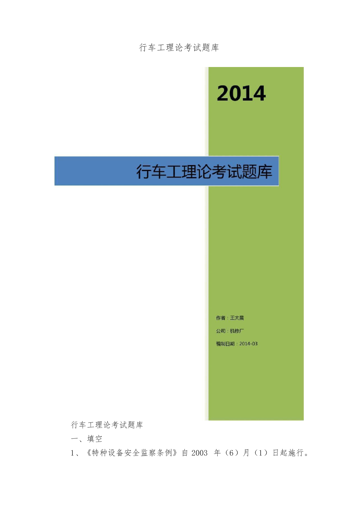 行车工理论考试题库行车工理论考试题库一、填空1、《特种设备安全监察条例》自2003年(6)月(1)日起施行。2、《特种设备安全监察条例》所称特种设备是指涉及(生命安全)、(危险性)较大的锅炉压力容器、起重机械、大型游乐设施等设备。3、特种设备作业人员在作业过程中应当严格执行特种设备的(操作规程)和有关的安全(规章制度)。4、特种设备作业人员在作业过程中发现(事故隐患)或其他不(安全因素),应当立即向现场安全管理人员和单位有关于负责人报告。5、特种设备作业人员,应当按照国家有关规定经特种设备安全监督管理部门