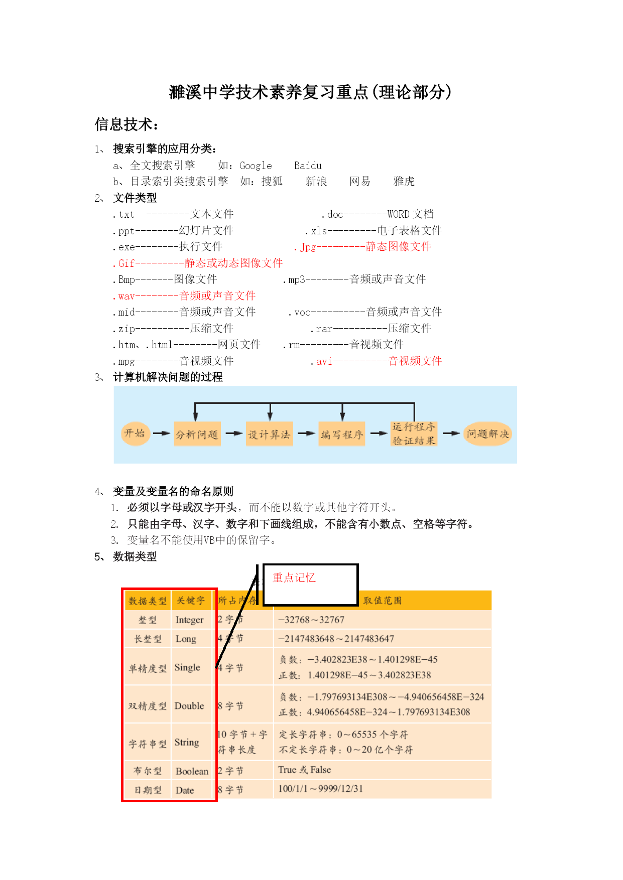濉溪中学技术素养复习重点(理论部分)信息技术:搜索引擎的应用分类:a、全文搜索引擎如:GoogleBaidub、目录索引类搜索引擎如:搜狐新浪网易雅虎文件类型.txt--------文本文件.doc--------WORD文档.ppt--------幻灯片文件.xls---------电子表格文件.exe--------执行文件.Jpg---------静态图像文件.Gif---------静态或动态图像文件.Bmp-------图像文件.mp3--------音频或声音文件.wav--------音频或