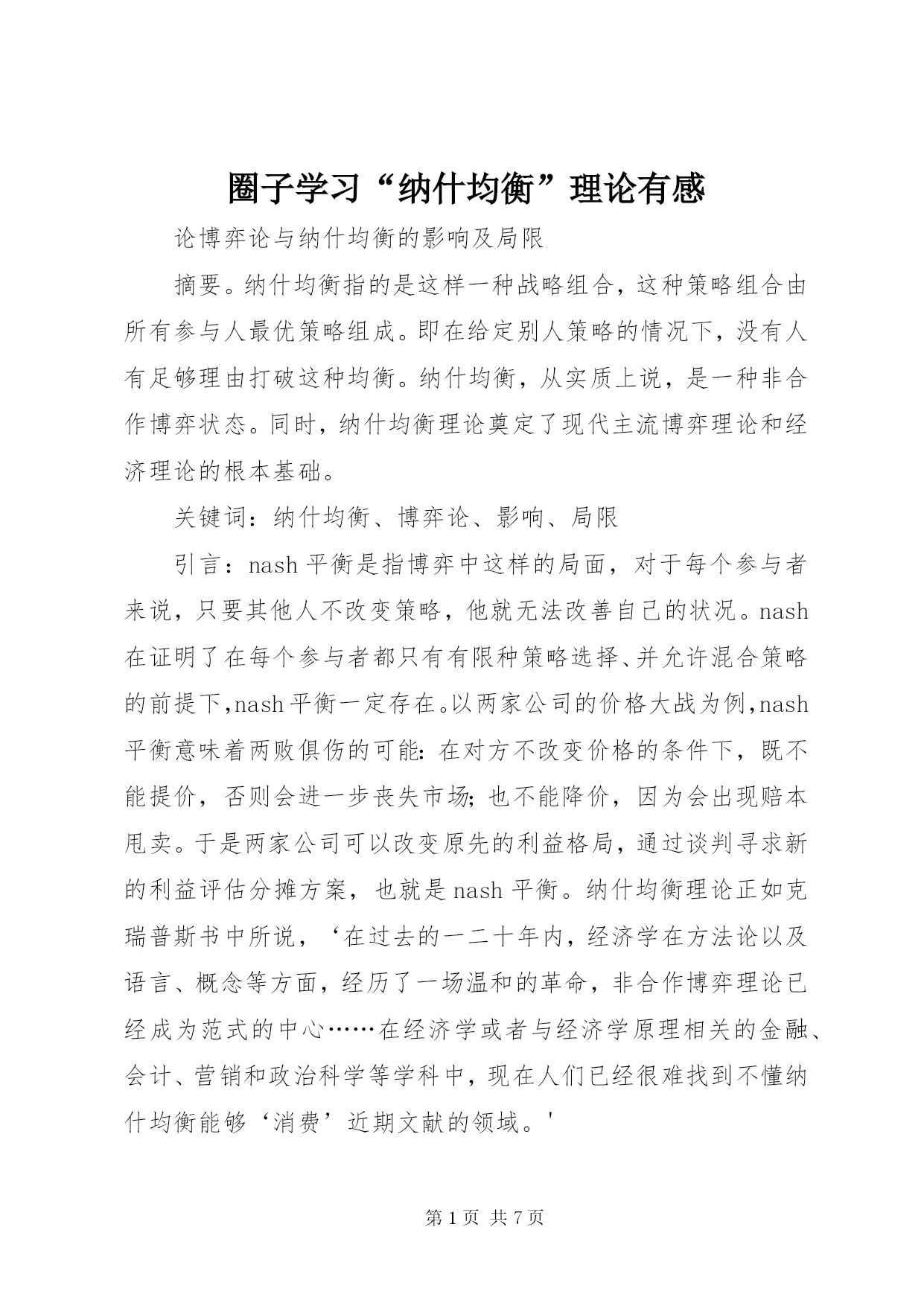 第PAGE\*Arabic\*MERGEFORMAT7页共NUMPAGES\*MERGEFORMAT7页圈子学习“纳什均衡”理论有感论博弈论与纳什均衡的影响及局限摘要。纳什均衡指的是这样一种战略组合,这种策略组合由所有参与人最优策略组成。即在给定别人策略的情况下,没有人有足够理由打破这种均衡。纳什均衡,从实质上说,是一种非合作博弈状态。同时,纳什均衡理论奠定了现代主流博弈理论和经济理论的根本基础。关键词:纳什均衡、博弈论、影响、局限引言:nash平衡是指博弈中这样的局面,对于每个参与者来说,只