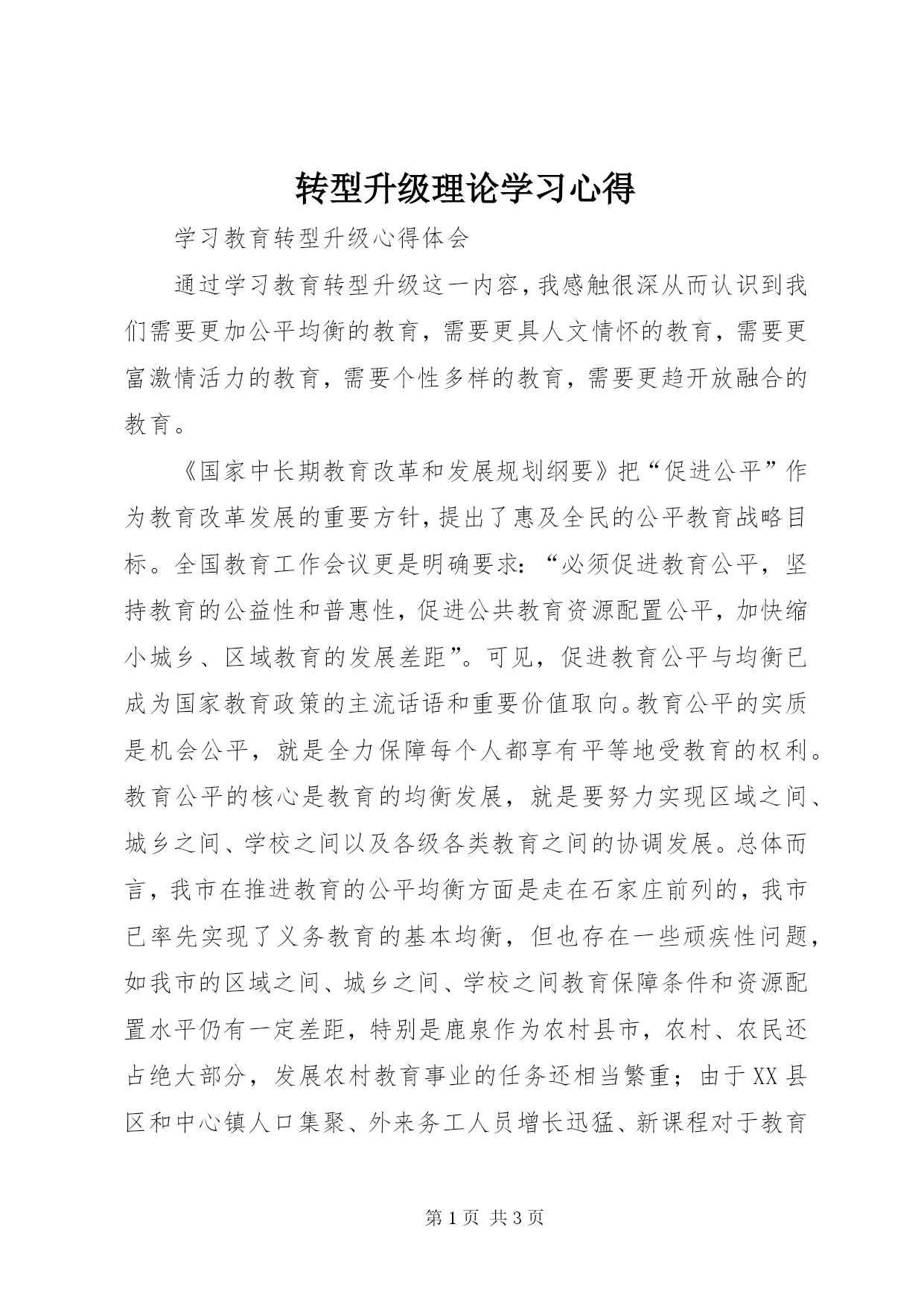 第PAGE\*Arabic\*MERGEFORMAT3页共NUMPAGES\*MERGEFORMAT3页转型升级理论学习心得学习教育转型升级心得体会通过学习教育转型升级这一内容,我感触很深从而认识到我们需要更加公平均衡的教育,需要更具人文情怀的教育,需要更富激情活力的教育,需要个性多样的教育,需要更趋开放融合的教育。《国家中长期教育改革和发展规划纲要》把“促进公平”作为教育改革发展的重要方针,提出了惠及全民的公平教育战略目标。全国教育工作会议更是明确要求:“必须促进教育公平,坚持教育的公益性和