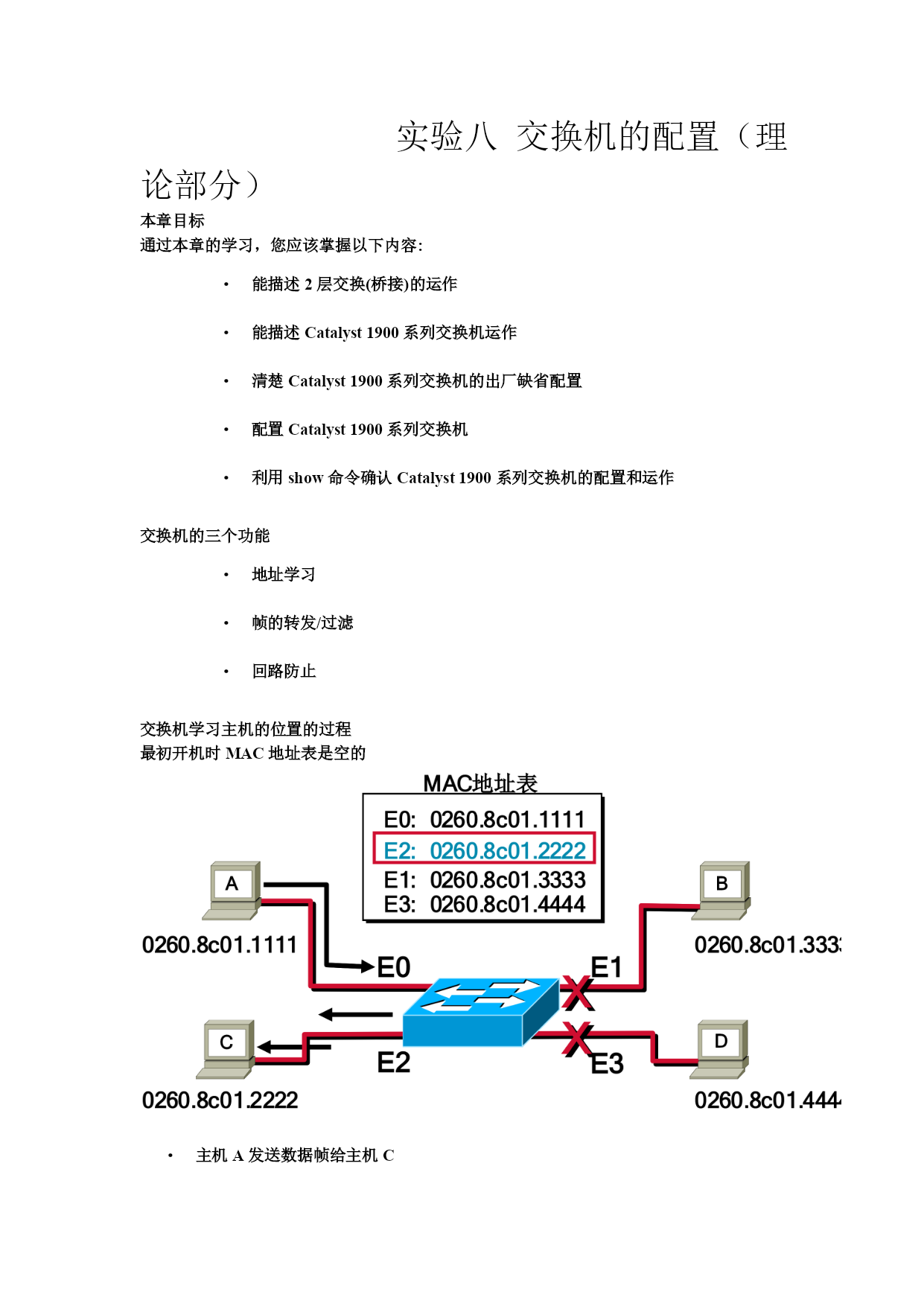 实验八交换机的配置(理论部分)本章目标通过本章的学习,您应该掌握以下内容:能描述2层交换(桥接)的运作能描述Catalyst1900系列交换机运作清楚Catalyst1900系列交换机的出厂缺省配置配置Catalyst1900系列交换机利用show命令确认Catalyst1900系列交换机的配置和运作交换机的三个功能地址学习帧的转发/过滤回路防止交换机学习主机的位置的过程最初开机时MAC地址表是空的主机A发送数据帧给主机C交换机通过学习数据帧的源MAC地址,记录下主机A的MAC地址对应端口E0该数据帧转发