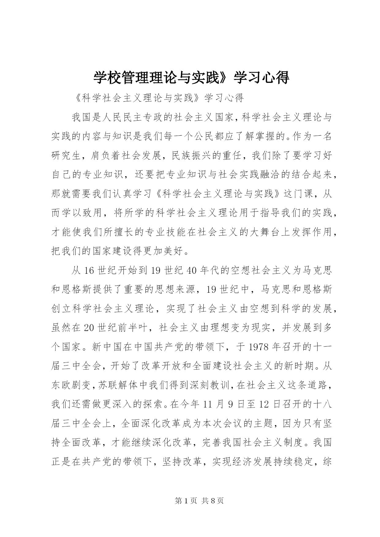 第PAGE\*Arabic\*MERGEFORMAT8页共NUMPAGES\*MERGEFORMAT8页学校管理理论与实践》学习心得《科学社会主义理论与实践》学习心得我国是人民民主专政的社会主义国家,科学社会主义理论与实践的内容与知识是我们每一个公民都应了解掌握的。作为一名研究生,肩负着社会发展,民族振兴的重任,我们除了要学习好自己的专业知识,还要把专业知识与社会实践融洽的结合起来,那就需要我们认真学习《科学社会主义理论与实践》这门课,从而学以致用,将所学的科学社会主义理论用于指导我们的实践,