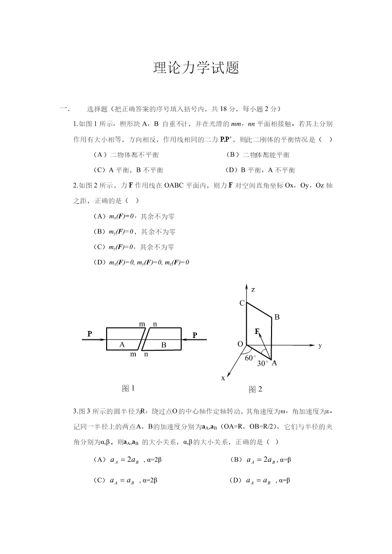 理论力学试题一.选择题(把正确答案的序号填入括号内,共18分,每小题2分)1.如图1所示,楔形块A,B自重不计,并在光滑的mm,nn平面相接触。若其上分别作用有大小相等,方向相反,作用线相同的二力P,P’,则此二刚体的平衡情况是()(A)二物体都不平衡(B)二物体都能平衡(C)A平衡,B不平衡(D)B平衡,A不平衡2.如图2所示,力F作用线在OABC平面内,则力F对空间直角坐标Ox,Oy,Oz轴之距,正确的是()(A)mx(F)=0,其余不为零(B)my(F)=0,其余不为零(C)mz(F)=0,其余不为