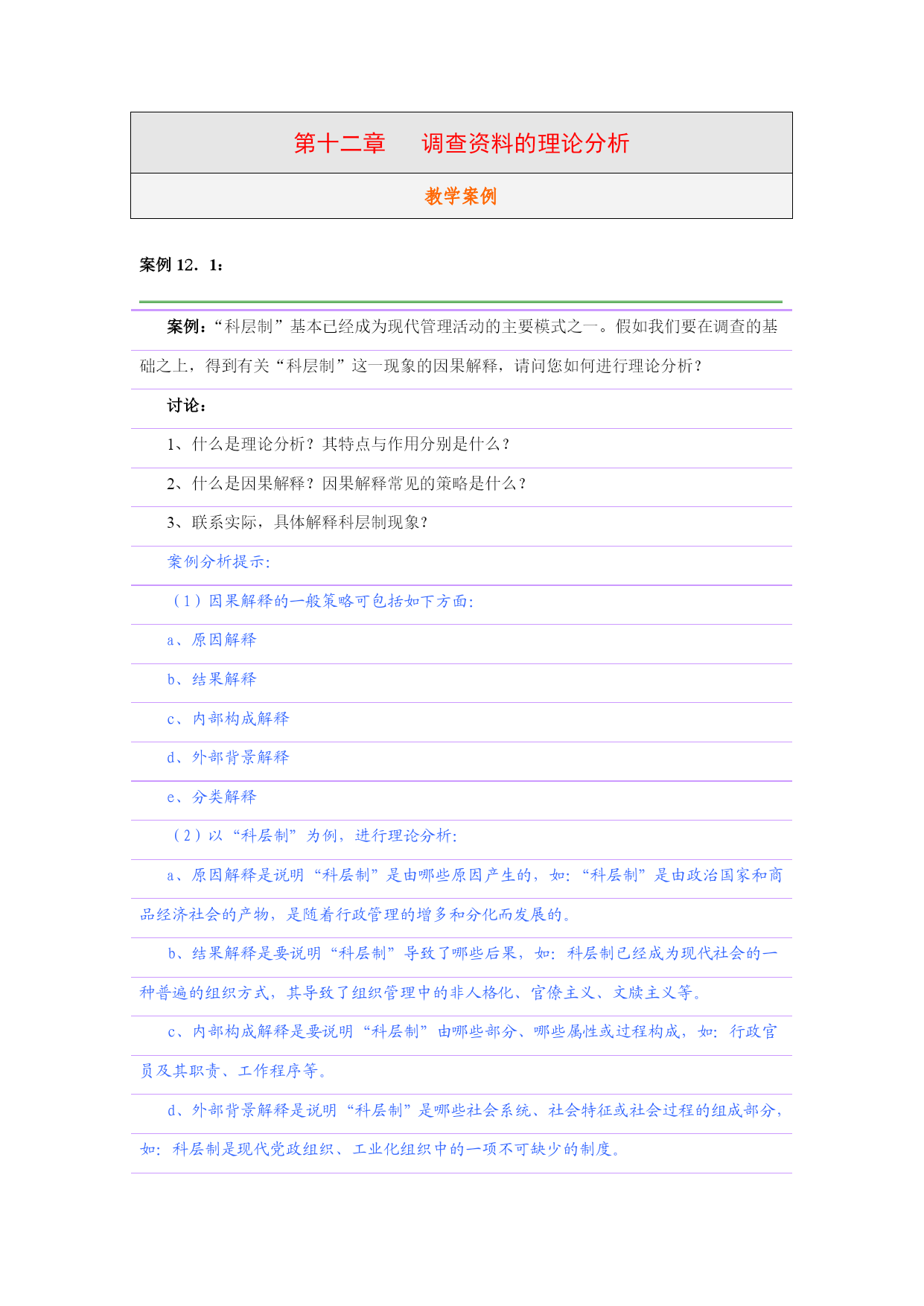 第十二章调查资料的理论分析教学案例案例12.1:案例:“科层制”基本已经成为现代管理活动的主要模式之一。假如我们要在调查的基础之上,得到有关“科层制”这一现象的因果解释,请问您如何进行理论分析?讨论:1、什么是理论分析?其特点与作用分别是什么?2、什么是因果解释?因果解释常见的策略是什么?3、联系实际,具体解释科层制现象?案例分析提示:(1)因果解释的一般策略可包括如下方面:a、原因解释b、结果解释c、内部构成解释d、外部背景解释e、分类解释(2)以“科层制”为例,进行理论分析:a、原因解释是说明“科层制