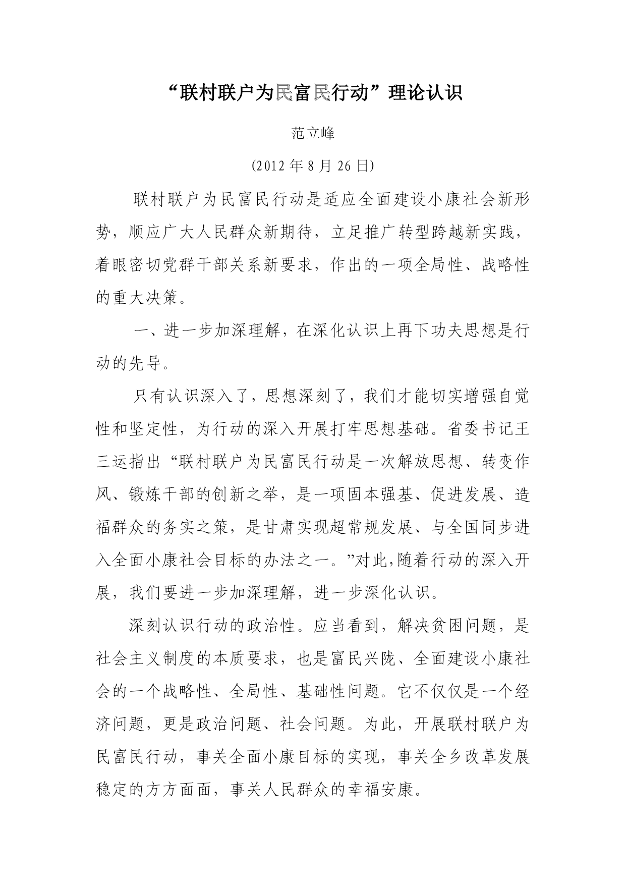 “联村联户为民富民行动”理论认识范立峰(2012年8月26日)联村联户为民富民行动是适应全面建设小康社会新形势,顺应广大人民群众新期待,立足推广转型跨越新实践,着眼密切党群干部关系新要求,作出的一项全局性、战略性的重大决策。一、进一步加深理解,在深化认识上再下功夫思想是行动的先导。只有认识深入了,思想深刻了,我们才能切实增强自觉性和坚定性,为行动的深入开展打牢思想基础。省委书记王三运指出“联村联户为民富民行动是一次解放思想、转变作风、锻炼干部的创新之举,是一项固本强基、促进发展、造福群众的务实之策,是甘肃