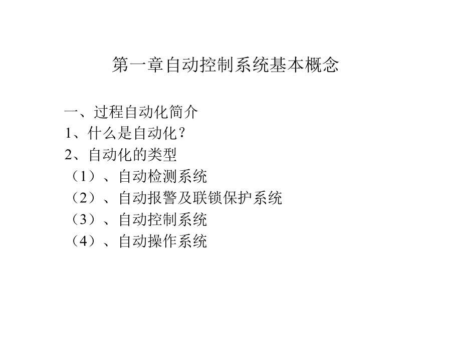 第一章自动控制系统基本概念二、自动控制系统2)、怎么办?即怎么调?调多少?3)、调节(手):根据思考的结果,调节响应阀门。4)、重复上述步骤至到温度满足要求为止。2、自动控制过程自动控制系统的组成自动控制系统的表示方法控制流程图方框图自动控制系统的类型自动控制系统的类型自动控制系统的类型自动控制系统的类型自动控制系统的类型自动控制系统的类型自动控制系统的类型自动控制系统的品质指标自动控制系统的品质指标自动控制系统的品质指标