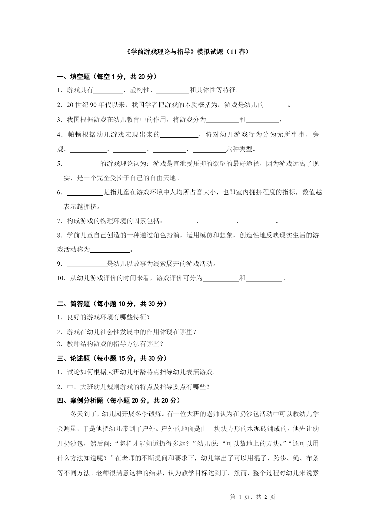 第PAGE2页,共NUMPAGES2页《学前游戏理论与指导》模拟试题(11春)一、填空题(每空1分,共20分)1.游戏具有、虚构性、和具体性等特征。2.20世纪90年代以来,我国学者把游戏的本质概括为:游戏是幼儿的。3.我国根据游戏在幼儿教育中的作用,将游戏分为和。4.帕顿根据幼儿游戏表现出来的,将对幼儿游戏行为分为无所事事、旁观、、、、六种类型。5.的游戏理论认为:游戏是宣泄受压抑的欲望的最好途径,因为游戏远离了现实,是一个完全受控于自己的自由天地。6.是指儿童在游戏环境中人均所占窨大小,也