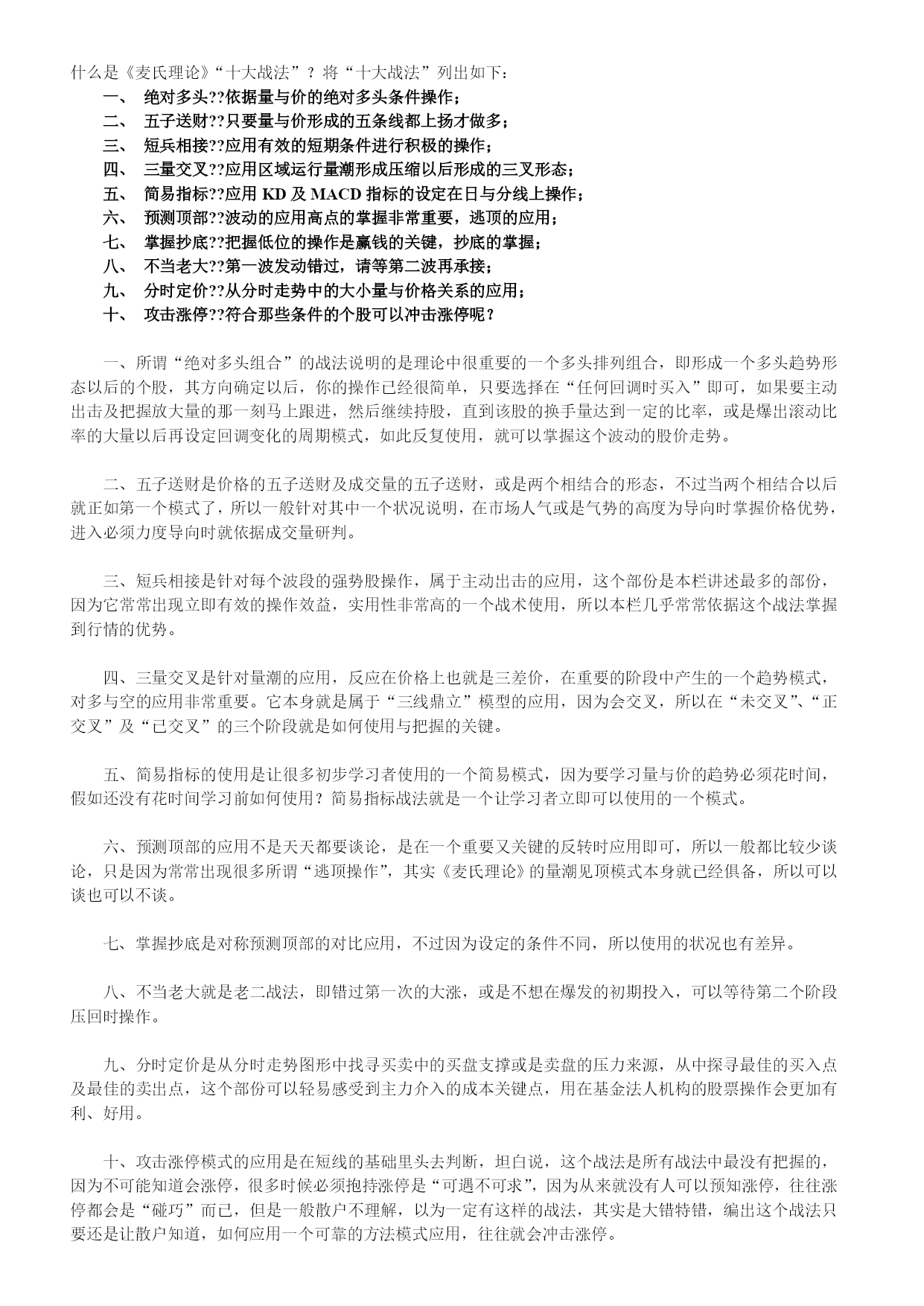 什么是《麦氏理论》“十大战法”?将“十大战法”列出如下:一、绝对多头??依据量与价的绝对多头条件操作;二、五子送财??只要量与价形成的五条线都上扬才做多;三、短兵相接??应用有效的短期条件进行积极的操作;四、三量交叉??应用区域运行量潮形成压缩以后形成的三叉形态;五、简易指标??应用KD及MACD指标的设定在日与分线上操作;六、预测顶部??波动的应用高点的掌握非常重要,逃顶的应用;七、掌握抄底??把握低位的操作是赢钱的关键,抄底的掌握;八、不当老大??第一波发动错过,请等第二波再承接;九、分时定价??从分