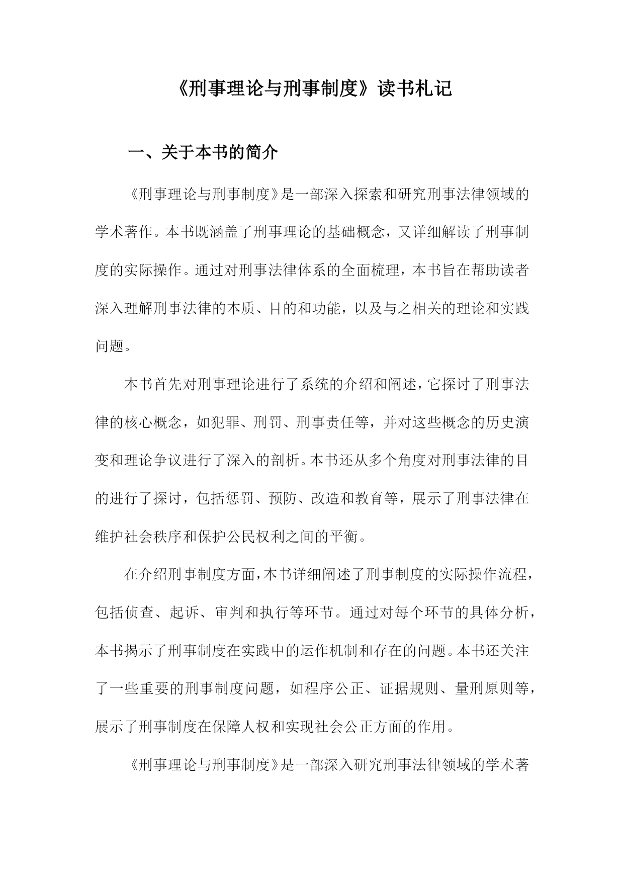 《刑事理论与刑事制度》读书札记一、关于本书的简介《刑事理论与刑事制度》是一部深入探索和研究刑事法律领域的学术著作。本书既涵盖了刑事理论的基础概念,又详细解读了刑事制度的实际操作。通过对刑事法律体系的全面梳理,本书旨在帮助读者深入理解刑事法律的本质、目的和功能,以及与之相关的理论和实践问题。本书首先对刑事理论进行了系统的介绍和阐述,它探讨了刑事法律的核心概念,如犯罪、刑罚、刑事责任等,并对这些概念的历史演变和理论争议进行了深入的剖析。本书还从多个角度对刑事法律的目的进行了探讨,包括惩罚、预防、改造和教育等,