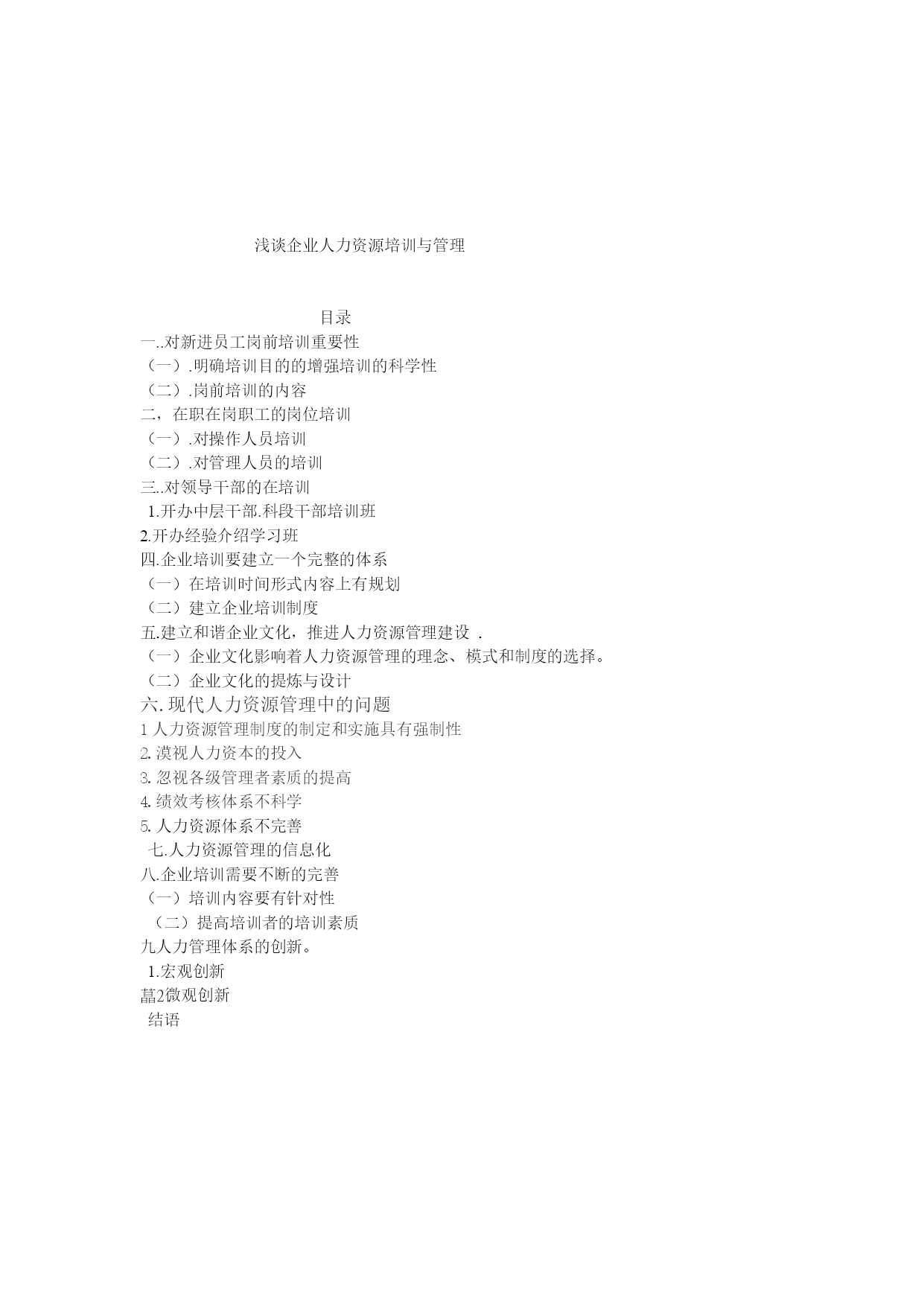 浅谈企业人力资源培训与管理目录.对新进员工岗前培训重要性(一).明确培训目的的增强培训的科学性(二).岗前培训的内容二,在职在岗职工的岗位培训(一).对操作人员培训(二).对管理人员的培训三..对领导干部的在培训1.开办中层干部.科段干部培训班开办经验介绍学习班四.企业培训要建立一个完整的体系(一)在培训时间形式内容上有规划(二)建立企业培训制度五.建立和谐企业文化,推进人力资源管理建设.(一)企业文化影响着人力资源管理的理念、模式和制度的选择。(二)企业文化的提炼与设计六.现代人力资源管理中的问题1人力