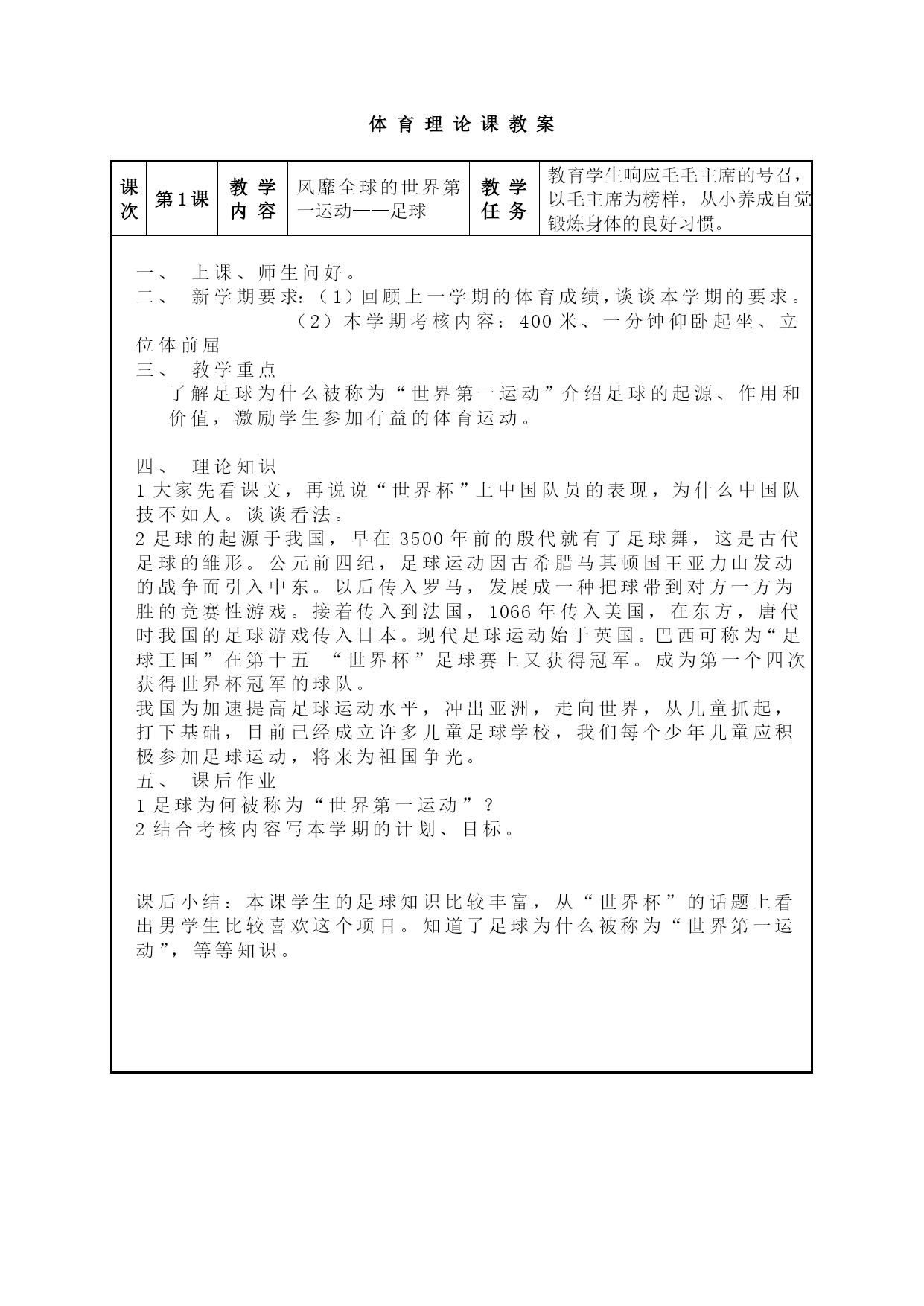 体育理论课教案课次第1课教学内容风靡全球的世界第一运动——足球教学任务教育学生响应毛毛主席的号召,以毛主席为榜样,从小养成自觉锻炼身体的良好习惯。上课、师生问好。新学期要求:(1)回顾上一学期的体育成绩,谈谈本学期的要求。(2)本学期考核内容:400米、一分钟仰卧起坐、立位体前屈教学重点了解足球为什么被称为“世界第一运动”介绍足球的起源、作用和价值,激励学生参加有益的体育运动。理论知识1大家先看课文,再说说“世界杯”上中国队员的表现,为什么中国队技不如人。谈谈看法。2足球的起源于我国,早在3500年前的殷