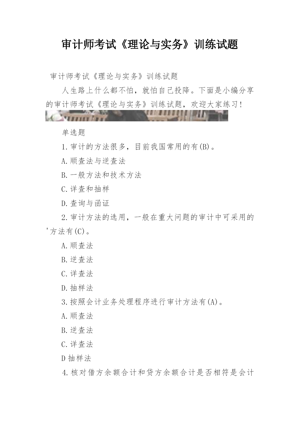 审计师考试《理论与实务》训练试题审计师考试《理论与实务》训练试题人生路上什么都不怕,就怕自己投降。下面是小编分享的审计师考试《理论与实务》训练试题,欢迎大家练习!单选题1.审计的方法很多,目前我国常用的有(B)。A.顺查法与逆查法B.一般方法和技术方法C.详查和抽样D.查询与函证2.审计方法的选用,一般在重大问题的审计中可采用的'方法有(C)。A.顺查法B.逆查法C.详查法D.抽样法3.按照会计业务处理程序进行审计方法有(A)。A.顺查法B.逆查法C.详查法D抽样法4.核对借方余额合计和贷方余额合计是否相