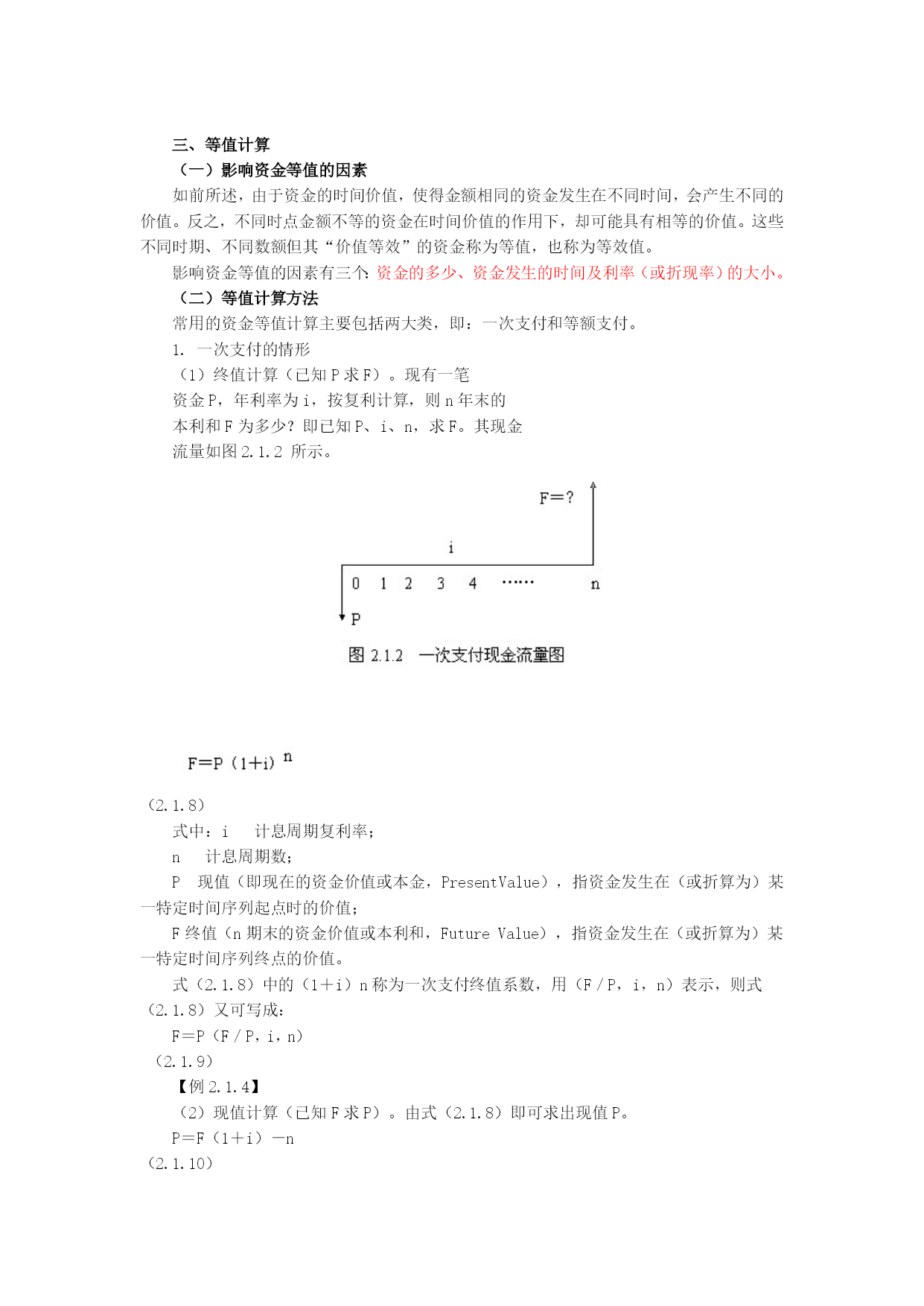 三、等值计算(一)影响资金等值的因素如前所述,由于资金的时间价值,使得金额相同的资金发生在不同时间,会产生不同的价值。反之,不同时点金额不等的资金在时间价值的作用下,却可能具有相等的价值。这些不同时期、不同数额但其“价值等效”的资金称为等值,也称为等效值。影响资金等值的因素有三个:资金的多少、资金发生的时间及利率(或折现率)的大小。(二)等值计算方法常用的资金等值计算主要包括两大类,即:一次支付和等额支付。1.一次支付的情形(1)终值计算(已知P求F)。现有一笔资金P,年利率为i,按复利计算,则n年末的本