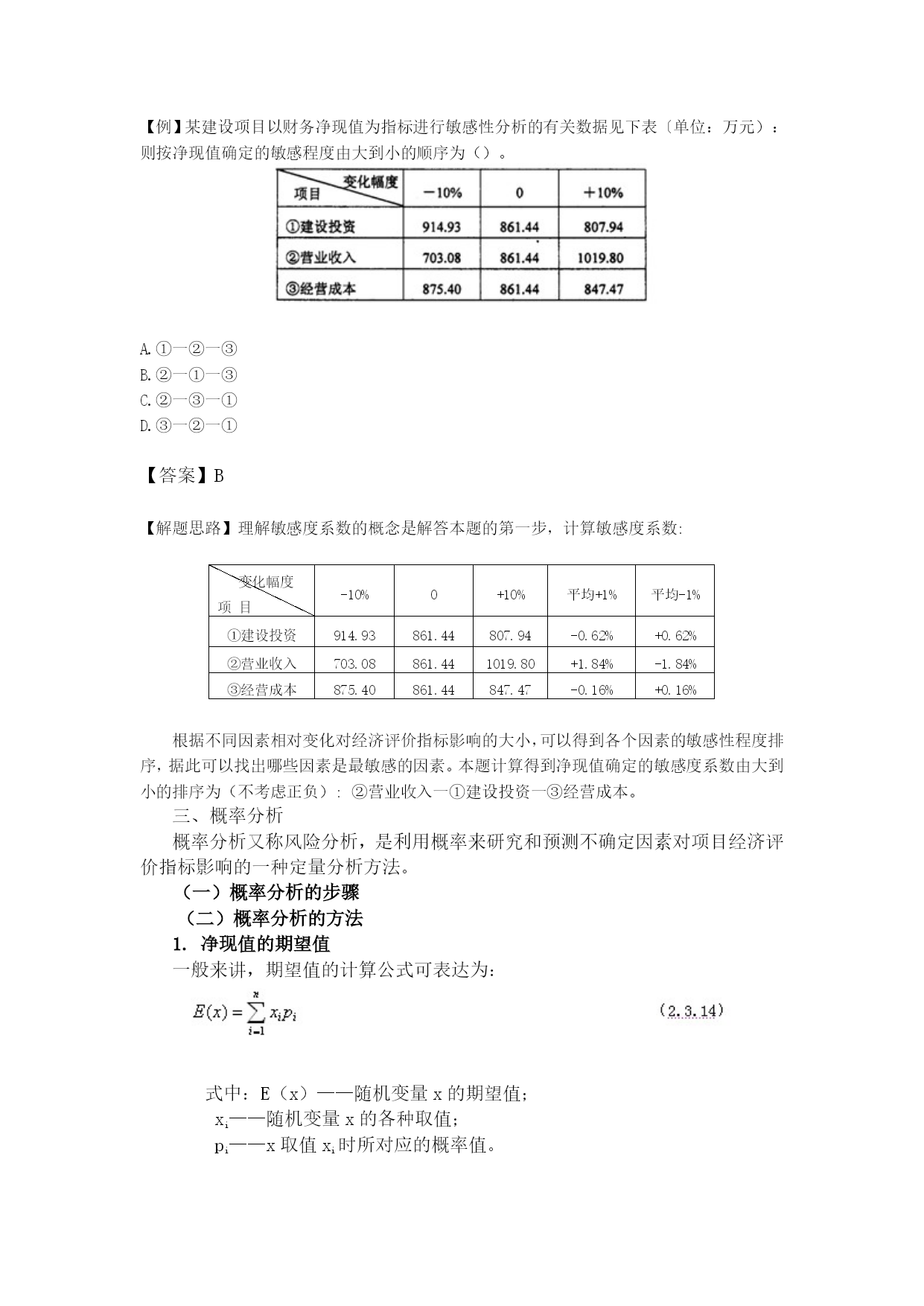 【例】某建设项目以财务净现值为指标进行敏感性分析的有关数据见下表〔单位:万元):则按净现值确定的敏感程度由大到小的顺序为()。A.①一②一③B.②一①一③C.②一③一①D.③一②一①【答案】B【解题思路】理解敏感度系数的概念是解答本题的第一步,计算敏感度系数:变化幅度项目-10%0+10%平均+1%平均-1%①建设投资914.93861.44807.94-0.62%+0.62%②营业收入703.08861.441019.80+1.84%-1.84%③经营成本875.40861.44847.47-0.16%