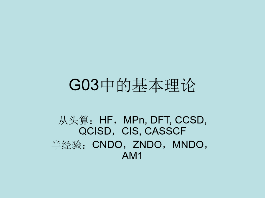 G03中的基本理论单粒子Shrodinger方程多粒子体系的Shrodinger方程无外场的原子、分子体系H算符Bohn-Oppenheimer近似分子轨道理论分子轨道是由基函数线性组合而成变分原理HF理论自洽场(SCF)求解HF方程MP2理论至二级微扰的能量E(2)是对HF能量的一级微扰DFT理论各种密度泛函理论差别在于选择交换泛函和相关泛函的不同密度泛函计算中的格点问题电子相关方法G03计算方法过程图示