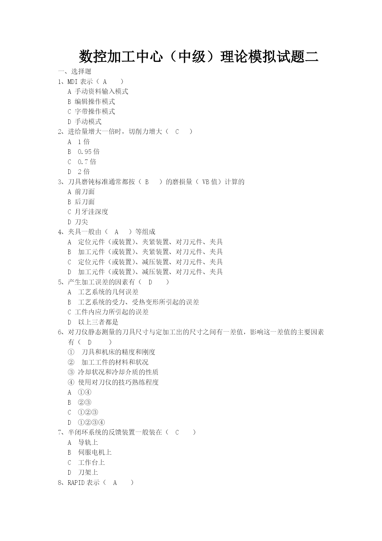 数控加工中心(中级)理论模拟试题二选择题1、MDI表示(A)A手动资料输入模式B编辑操作模式C字带操作模式D手动模式2、进给量增大一倍时,切削力增大(C)A1倍B0.95倍C0.7倍D2倍3、刀具磨钝标准通常都按(B)的磨损量(VB值)计算的A前刀面B后刀面C月牙洼深度D刀尖4、夹具一般由(A)等组成A定位元件(或装置)、夹紧装置、对刀元件、夹具B加工元件(或装置)、夹紧装置、对刀元件、夹具C定位元件(或装置)、减压装置、对刀元件、夹具D加工元件(或装置)、减压装置、对刀元件、夹具5、产生加工误差的因素有