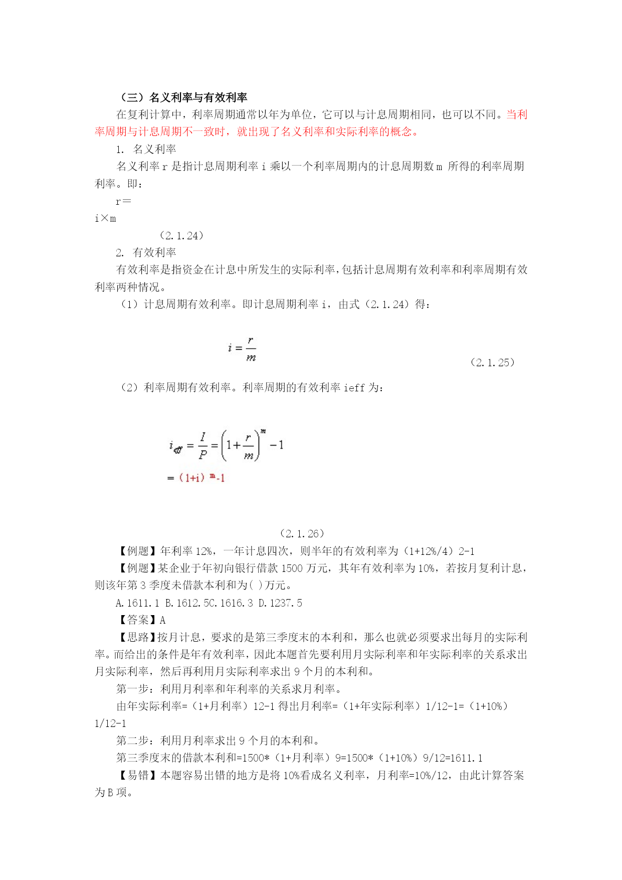 (三)名义利率与有效利率在复利计算中,利率周期通常以年为单位,它可以与计息周期相同,也可以不同。当利率周期与计息周期不一致时,就出现了名义利率和实际利率的概念。1.名义利率名义利率r是指计息周期利率i乘以一个利率周期内的计息周期数m所得的利率周期利率。即:r=i×m(2.1.24)2.有效利率有效利率是指资金在计息中所发生的实际利率,包括计息周期有效利率和利率周期有效利率两种情况。(1)计息周期有效利率。即计息周期利率i,由式(2.1.24)得:(2.1.25)(2)利率周期有效利率。利率周期的有效利率i
