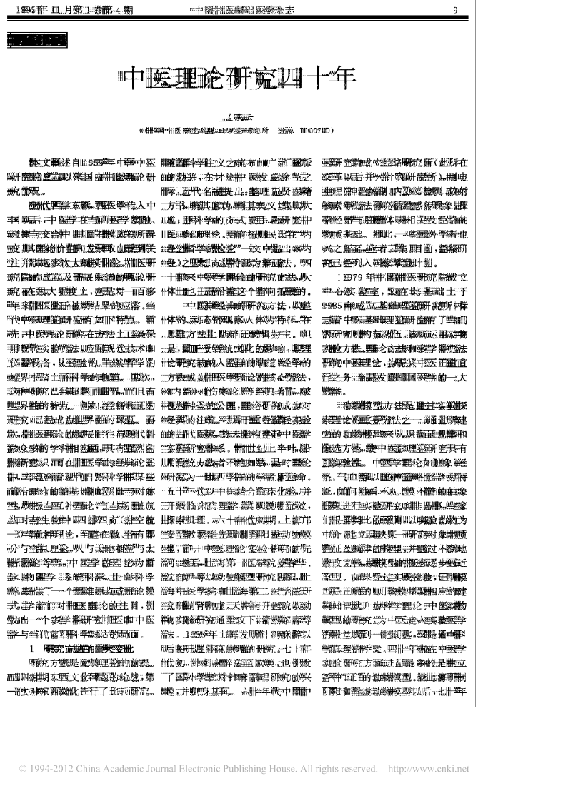 1995年n月第1卷第4期中国中医基础医学杂志中医理论研究四十年孟庆云(中国中医研究院基拙理论研究所北京100700)本文概述自1955年中国中医随着科学主义之流布加广,汇通派医研究院成立经络研究所(此所在研究院成立以来国内中医理论研的勃兴,在讨论中医发展途径之文革以后并入针灸研究所),用电。、、、究简况际,近代名家提出:整理先贤医籍生理神经解剖内分泌检测放射近代西学东渐,西医学传入中方书,辨其真伪,阐其奥义,集其大核素等方法研究循经感传现象,探国以后,中医学在与西医学接触、成;用科学的方式或手段研究中索