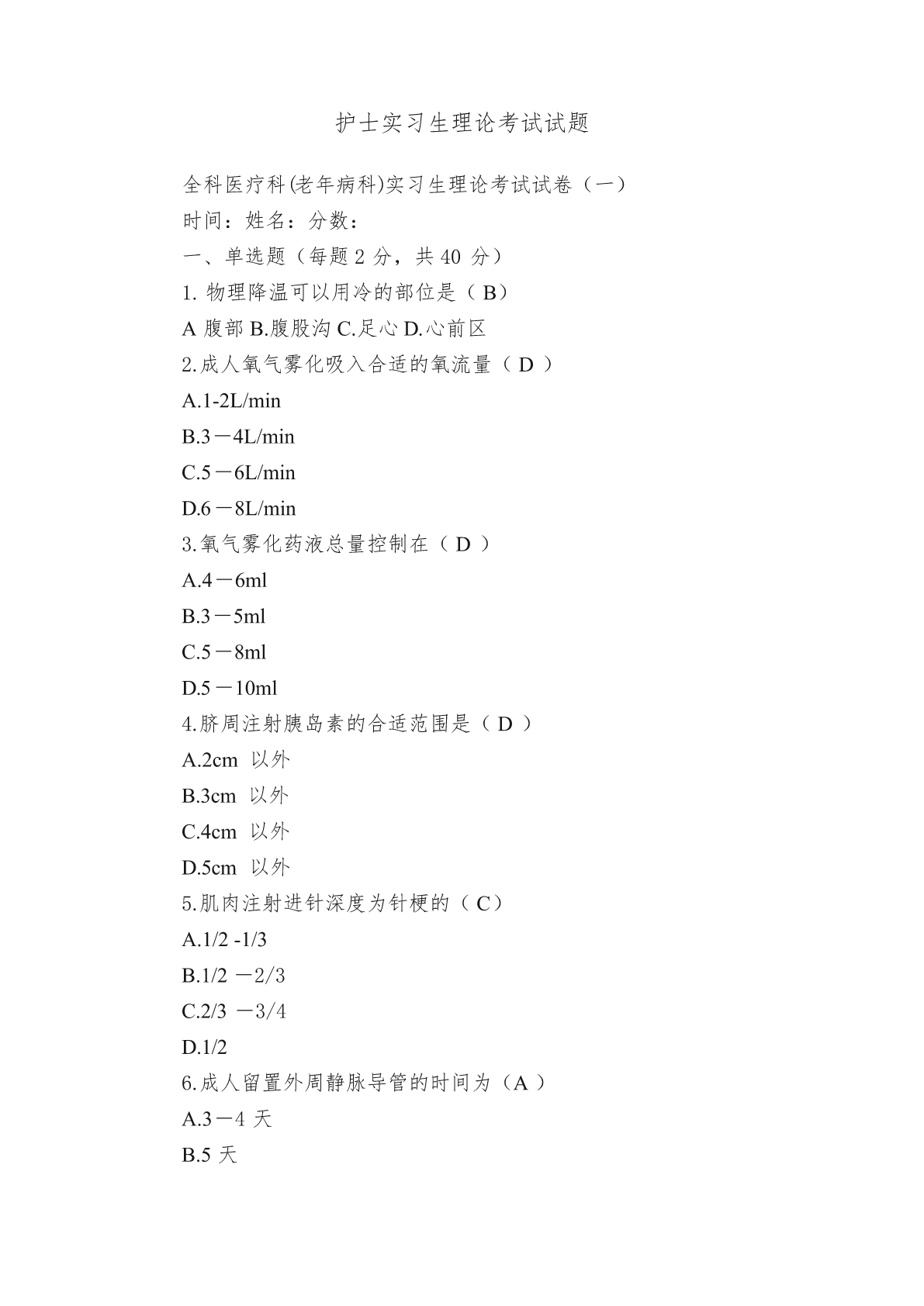 护士实习生理论考试试题全科医疗科(老年病科)实习生理论考试试卷(一)时间:姓名:分数:一、单选题(每题2分,共40分)1.物理降温可以用冷的部位是(B)A腹部B.腹股沟C.足心D.心前区2.成人氧气雾化吸入合适的氧流量(D)A.1-2L/minB.3-4L/minC.5-6L/minD.6-8L/min3.氧气雾化药液总量控制在(D)A.4-6mlB.3-5mlC.5-8mlD.5-10ml4.脐周注射胰岛素的合适范围是(D)A.2cm以外B.3cm以外C.4cm以外D.5cm以外5.肌肉注射进针深度为针