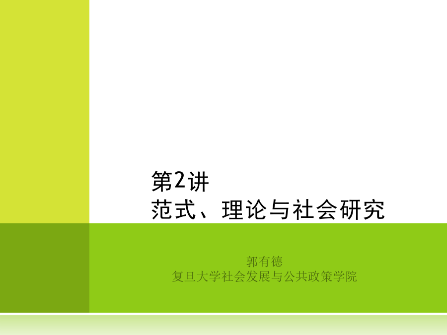 郭有德复旦大学社会发展与公共政策学院内容提要导言几种社会科学范式范式之-宏观与微观理论范式之-早期实证主义范式之-社会达尔文主义范式之-冲突范式范式之-符号互动主义范式之-常人方法论范式之-结构功能主义范式之-女性主义范式再论理性的客观性社会理论的要素传统的科学方法谁倾向于向教会寻求安慰?两种逻辑体系演绎式理论建构归纳式理论建构理论与研究的关联性演绎法与归纳法的比较