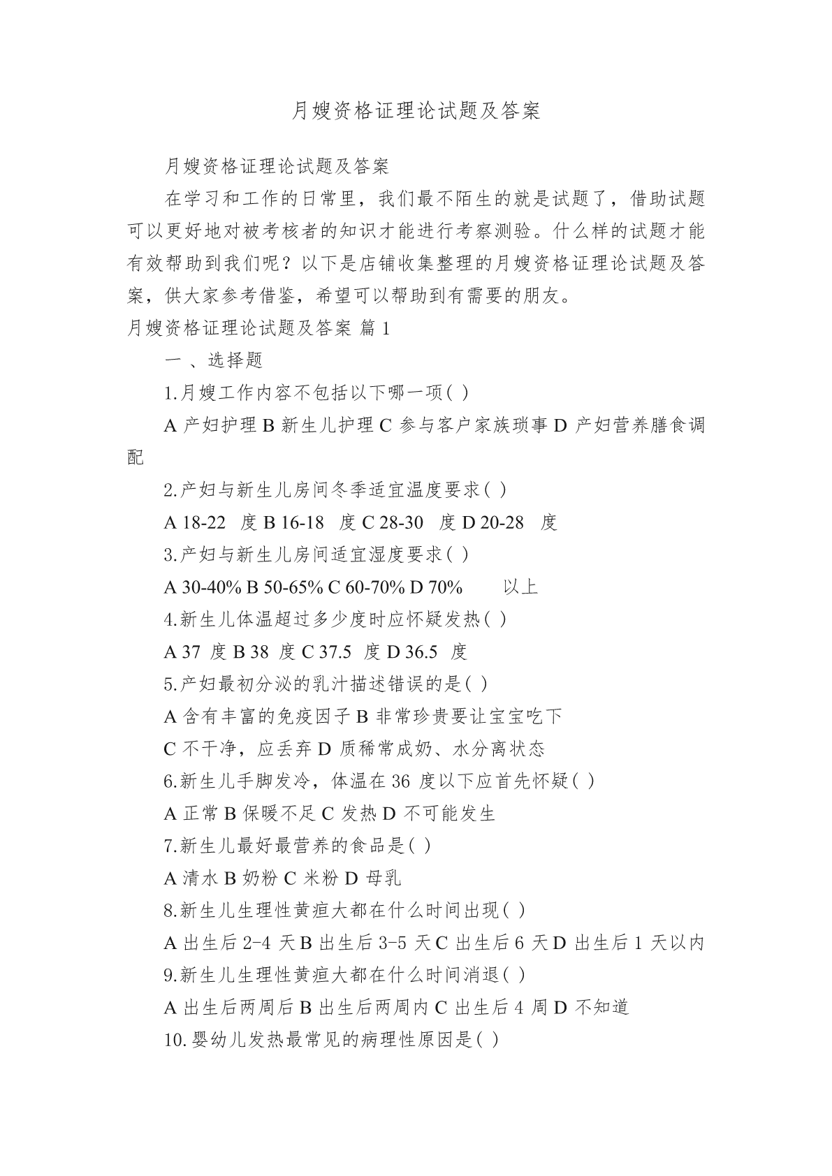 月嫂资格证理论试题及答案月嫂资格证理论试题及答案在学习和工作的日常里,我们最不陌生的就是试题了,借助试题可以更好地对被考核者的知识才能进行考察测验。什么样的试题才能有效帮助到我们呢?以下是店铺收集整理的月嫂资格证理论试题及答案,供大家参考借鉴,希望可以帮助到有需要的朋友。月嫂资格证理论试题及答案篇1一、选择题1.月嫂工作内容不包括以下哪一项()A产妇护理B新生儿护理C参与客户家族琐事D产妇营养膳食调配2.产妇与新生儿房间冬季适宜温度要求()A18-22度B16-18度C28-30度D20-28度3.产妇与
