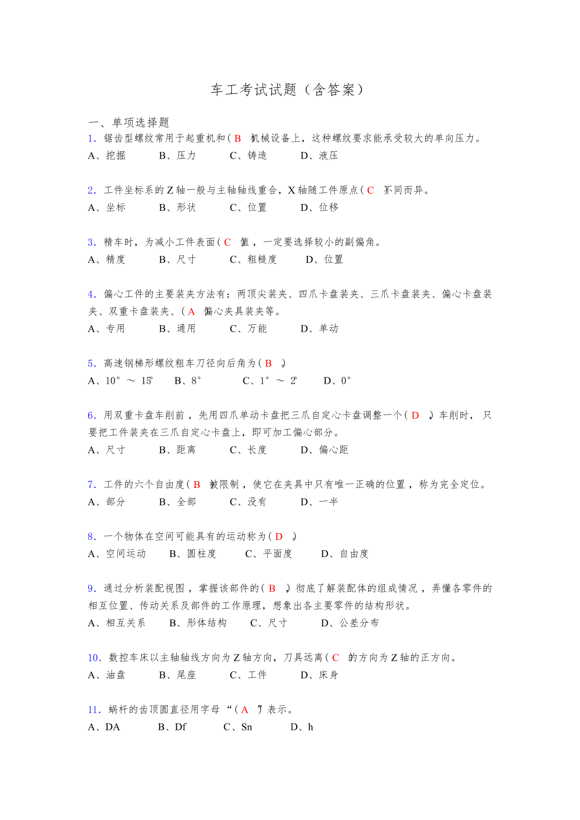 车工考试试题(含答案)一、单项选择题1.锯齿型螺纹常用于起重机和(B机械设备上,这种螺纹要求能承受较大的单向压力。)A、挖掘B、压力C、铸造D、液压2.工件坐标系的Z轴一般与主轴轴线重合,X轴随工件原点(C不同而异。)A、坐标B、形状C、位置D、位移3.精车时,为减小工件表面(C值),一定要选择较小的副偏角。A、精度B、尺寸C、粗糙度D、位置4.偏心工件的主要装夹方法有:两顶尖装夹、四爪卡盘装夹、三爪卡盘装夹、偏心卡盘装夹、双重卡盘装夹、(A偏心夹具装夹等。)A、专用B、通用C、万能D、单动5.高速钢梯形