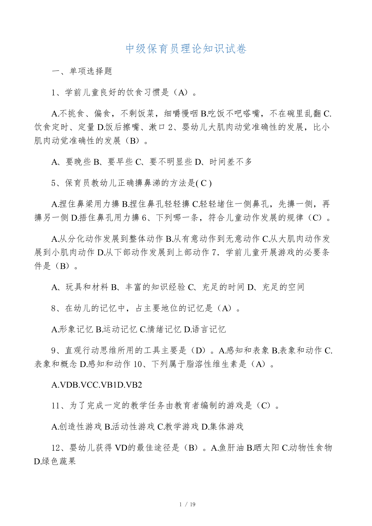中级保育员理论知识试卷一、单项选择题1、学前儿童良好的饮食习惯是(A)。A.不挑食、偏食,不剩饭菜,细嚼慢咽B.吃饭不吧嗒嘴,不在碗里乱翻C.饮食定时、定量D.饭后擦嘴、漱口2、婴幼儿大肌肉动觉准确性的发展,比小肌肉动觉准确性的发展(B)。A、要晚些B、要早些C、要不明显些D、时间差不多5、保育员教幼儿正确擤鼻涕的方法是(C)A.捏住鼻梁用力擤B.捏住鼻孔轻轻擤C.轻轻堵住一侧鼻孔,先擤一侧,再擤另一侧D.捂住鼻孔用力擤6、下列哪一条,符合儿童动作发展的规律(C)。A.从分化动作发展到整体动作B.从有意动