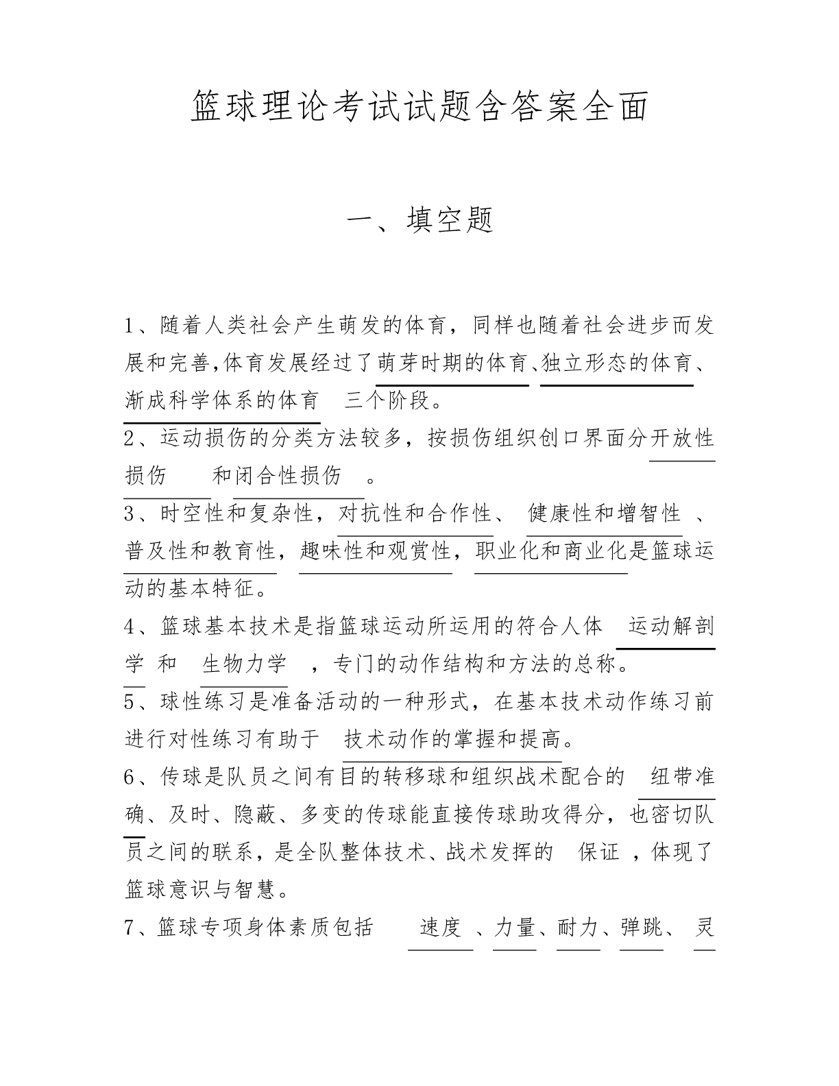 篮球理论考试试题含答案全面一、填空题1、随着人类社会产生萌发的体育,同样也随着社会进步而发展和完善,体育发展经过了萌芽时期的体育、独立形态的体育、渐成科学体系的体育三个阶段。2、运动损伤的分类方法较多,按损伤组织创口界面分开放性损伤和闭合性损伤。3、时空性和复杂性,对抗性和合作性、健康性和增智性、普及性和教育性,趣味性和观赏性,职业化和商业化是篮球运动的基本特征。4、篮球基本技术是指篮球运动所运用的符合人体运动解剖学和生物力学,专门的动作结构和方法的总称。5、球性练习是准备活动的一种形式,在基本技术动作练